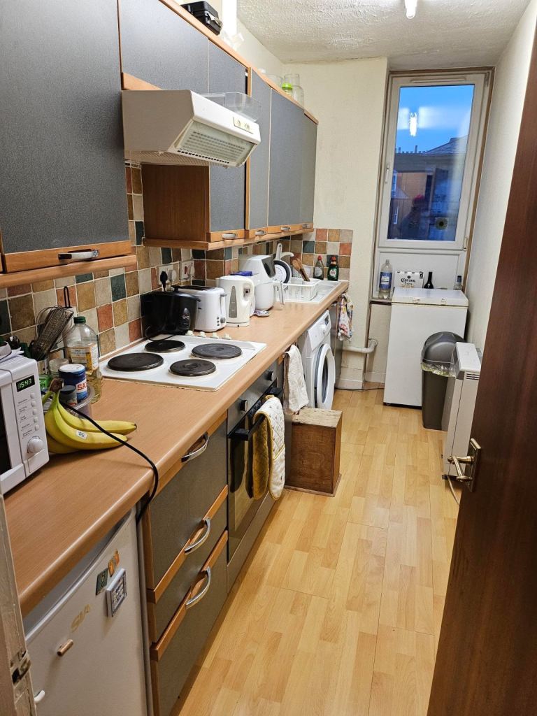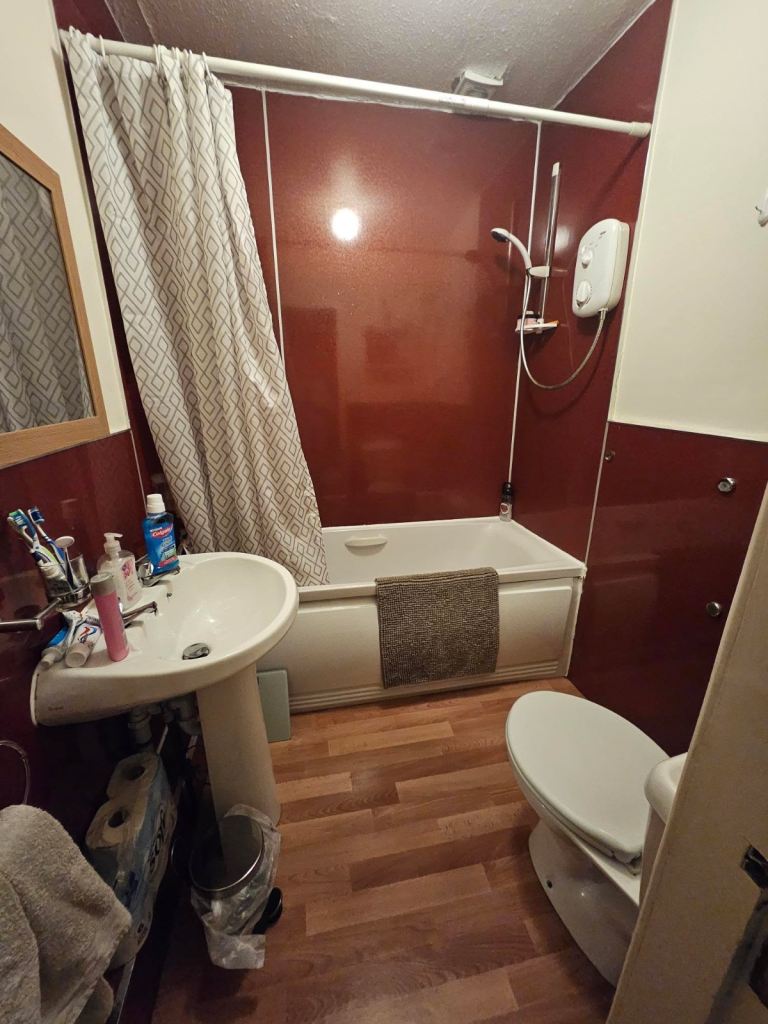Bathroom has electric shower and small cupboards for storage above the toilet. The kitchen includes a washing machine, microwave, toaster, kettle, and a separate fridge and freezer. We also have an ironing board, iron, and vacuum stored in the sitting room.