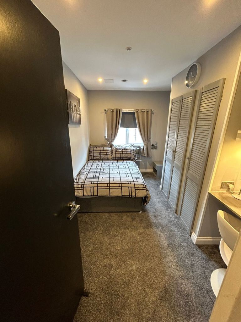 The Bedroom Is Fully Furnished with a Double Bed, Wardrobe, Drawers, Bedside Table, Lamp, Desk, Chair, 42" Smart TV Including Amazon FireStick, Thermal Blackout Blinds & Curtains, Clothes Drying Rail, Coat Hangers & Artwork Decorating the Walls. This room also has a fully kitted out kitchenette including Fridge, Microwave, Hob, Kettle, Toaster, Pots, Pans and Cutlery.