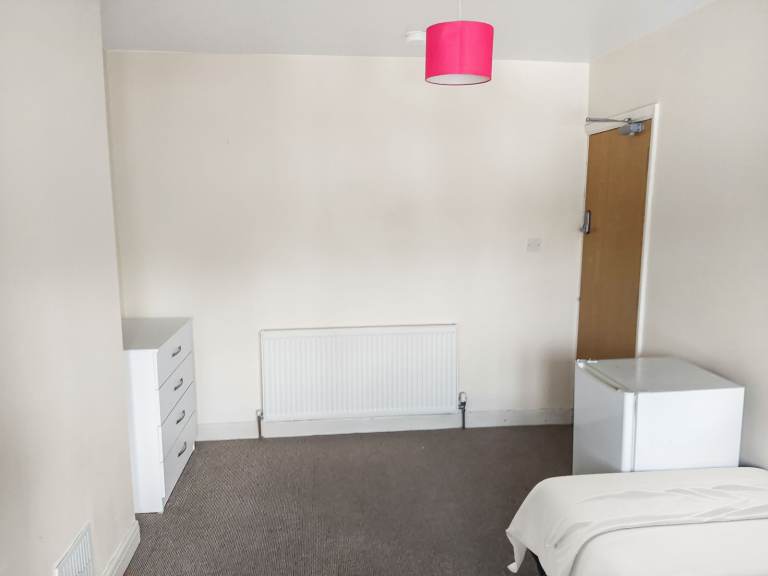 Bedroom with good quality bed, wardrobe, chest of drawers, own fridge in room and all new bedding provided.