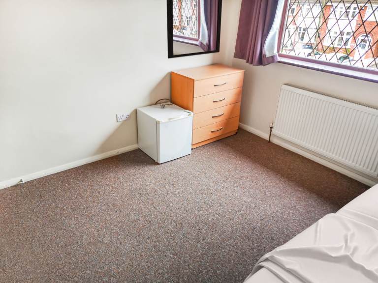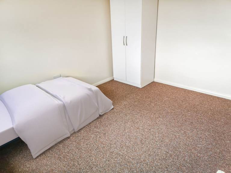 Bedroom with good quality bed, wardrobe, chest of drawers, own fridge in room and all new bedding provided.