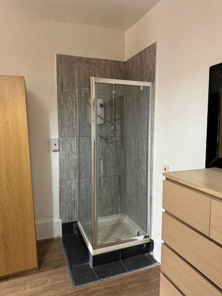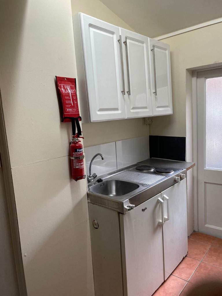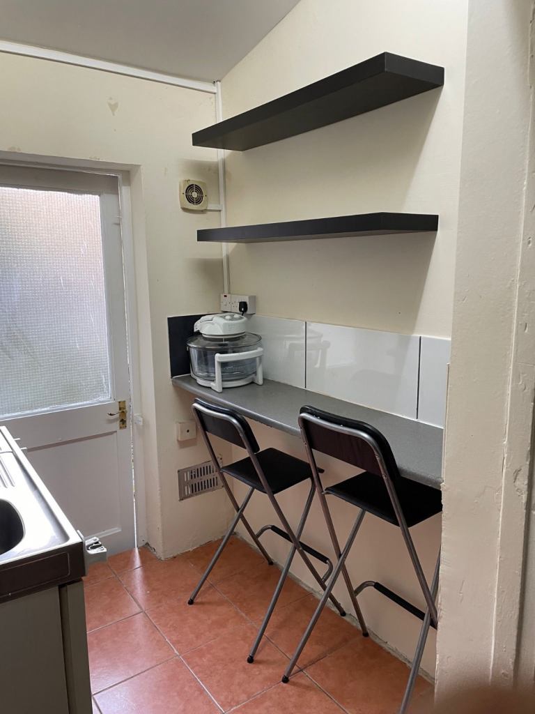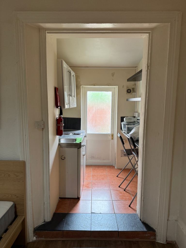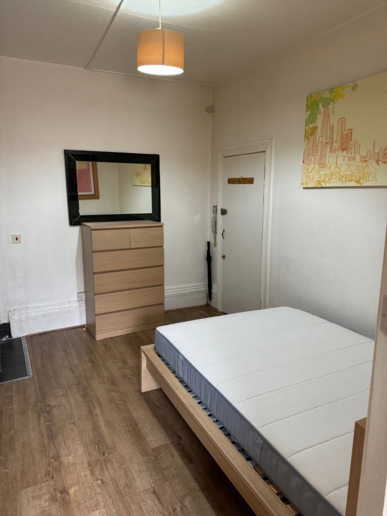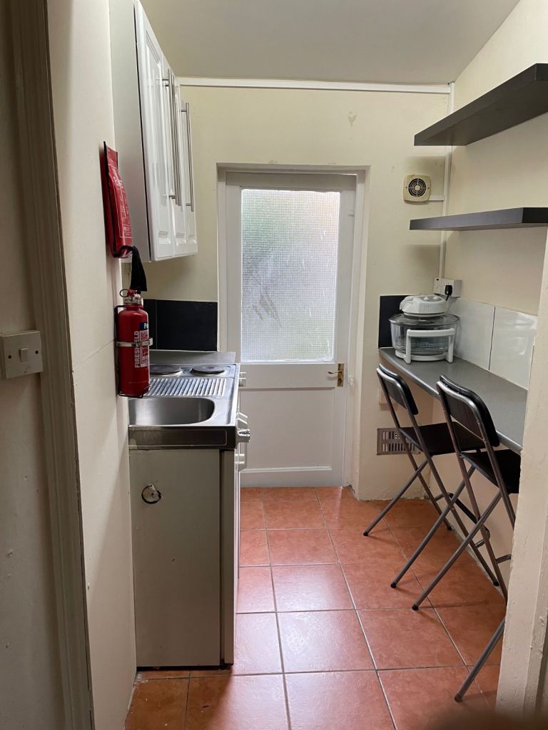 Clean, Studio. Comprises double bed, wardrobe, chest of draws, laminated flooring, breakfast bar and stools, mini fridge and freezer compartment, 2 cooking rings. Own non shared shower. Communal toilet shared with 3 other bed-sits. Small outside garden space.