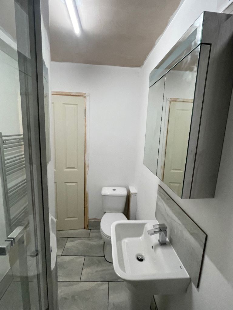 1st Bathroom has electric shower over the bath, toilet basin and mirrored cabinet.