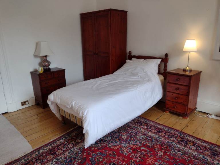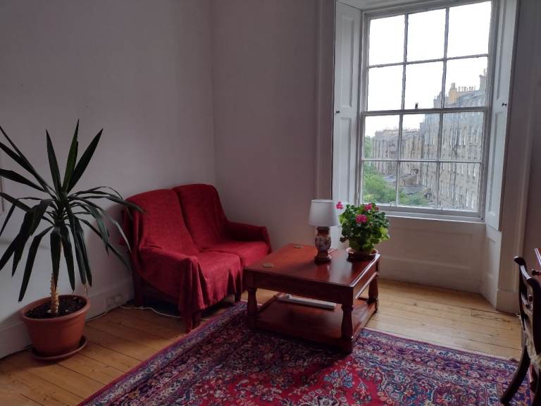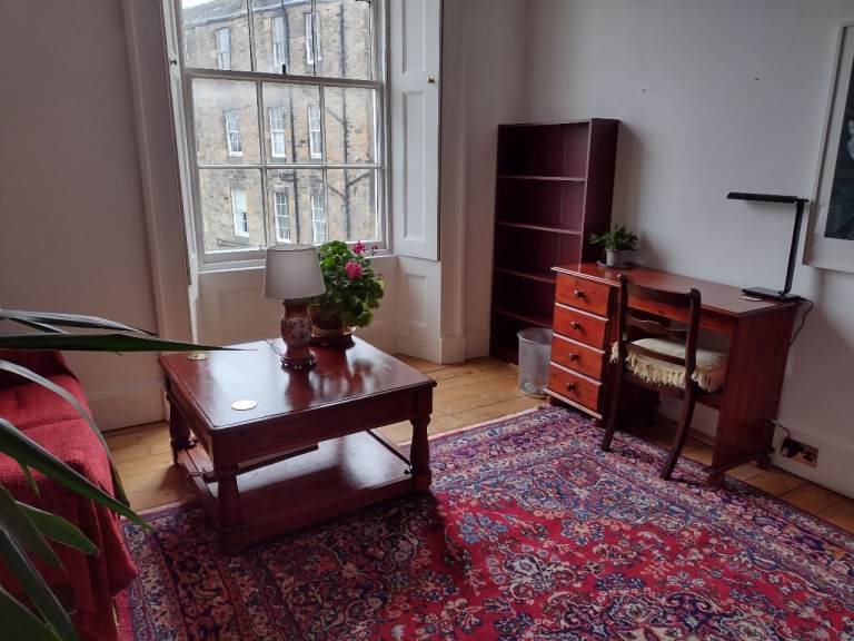 Large bright room (8.2m x 3.6m floor space) with high ceiling, overlooking gardens. 10 minutes walk to Waverley Station. Shared kitchen/diner and bathroom/toilet. WiFi access, electricity, central heating and council tax all included in the rent. We (Harry & Peter) are looking for a tidy, quiet, mature female lodger either postgrad or professional, non-smoker. £250 deposit required. Available May 1st 2026.
