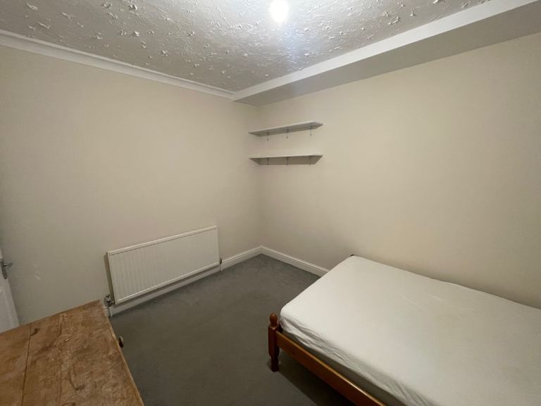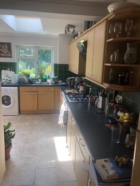 I have a bright double room with window facing onto the back garden which is south facing. The room has been very recently decorated and is furnished and comes with a sturdy double bed, double mattress, cupboard, shelving and a clothes rack. Optional chest of drawers. The bathroom is next door and has a bath and separate mains shower and cubicle. The downstairs living space is open-plan into the kitchen, very light, full of houseplants and there is of plenty of space to live in. The kitchen has a lot of cupboard space, gas cooker, fridge/freezer….lots of space for cooking if that’s your thing. There is also a good sized back garden and a patio with table and chairs in the warmer months.