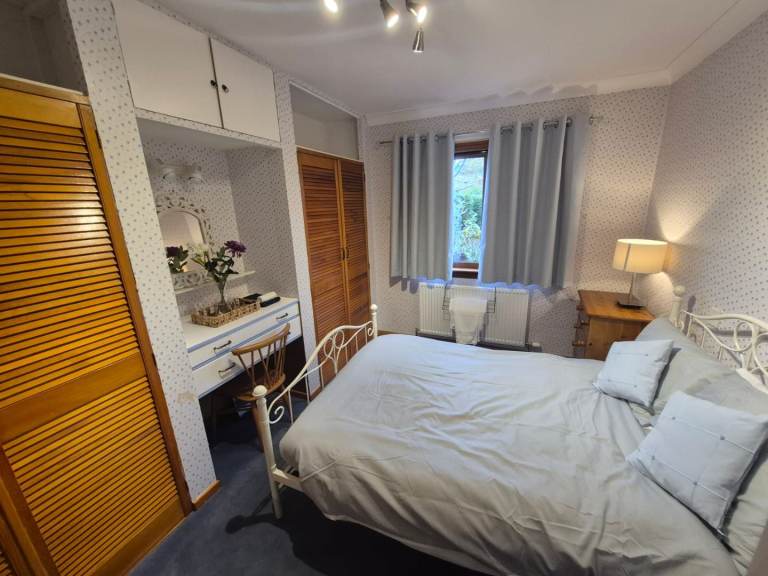 The bedroom is bright and generously sized, featuring two huge wardrobes and a built-in vanity/desk, ideal for getting ready or working from home.
