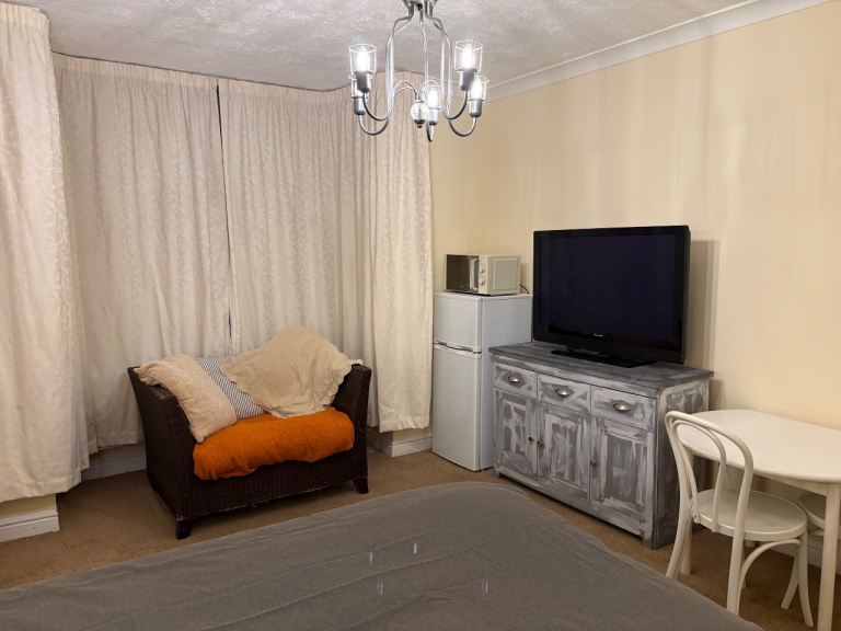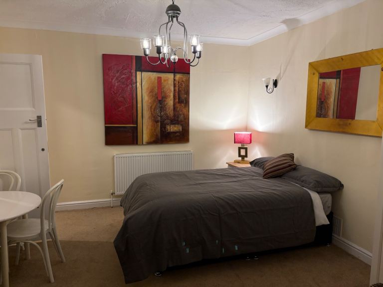 Professional quiet house Beautiful ground floor studio recently refurbished large main room shower w/c Mini kitchen and use of main shared kitchen. TV WiFi washing machine washing line and rear patio social area .