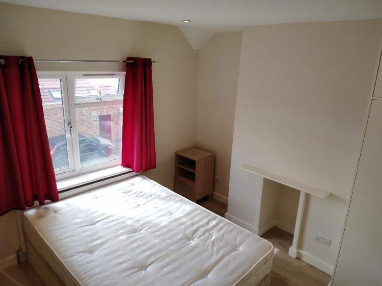 Spacious double room available for single use in a newly refurbished house, the room is fully furnished with a double bed, fitted wardrobe, chest of drawers, bedside unit, a chair & over looking the front garden.