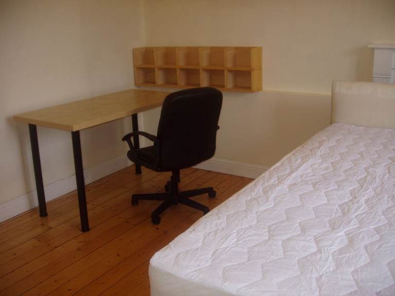 The double room is nicely presented, light and spacious: benefitting from an east facing aspect , it has sanded and vanished floorboards, gas central heating , double bed, bedside unit, mirrored wardrobe, desk, office chair & bookshelf.