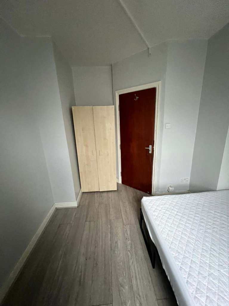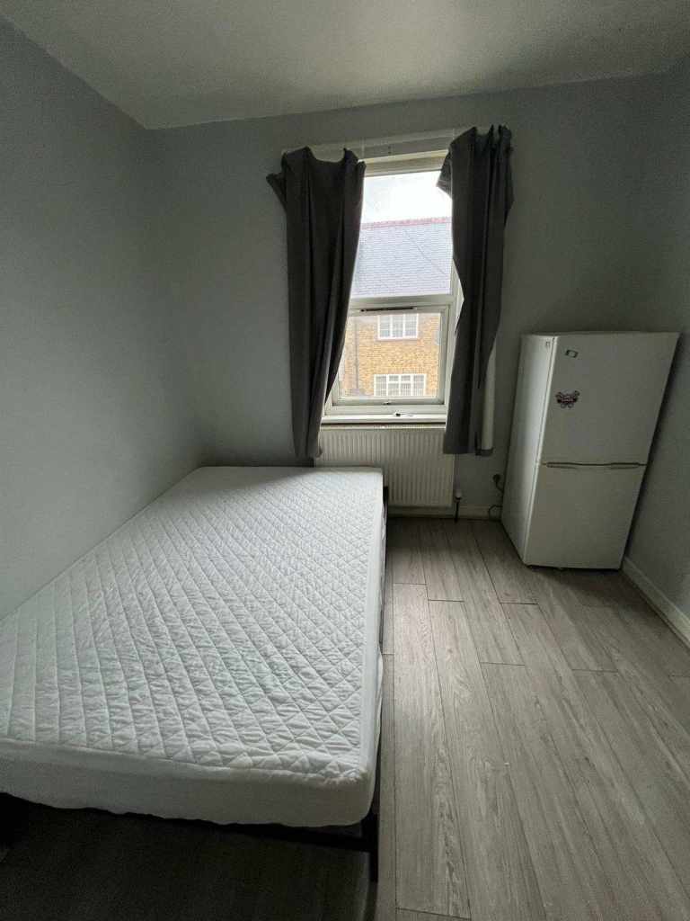 The room is furnished and includes a bed (with a mattress protector), a wardrobe, and a mini-fridge.
