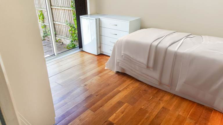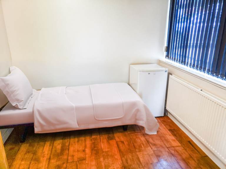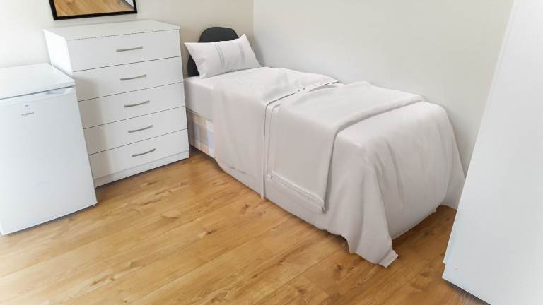 Bedroom with good quality bed, wardrobe, chest of drawers, own fridge in room and all new bedding provided.