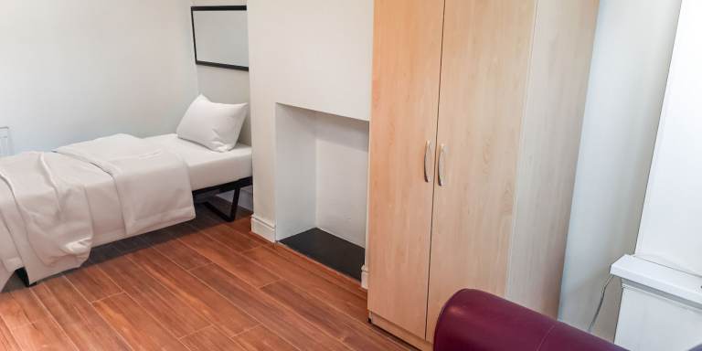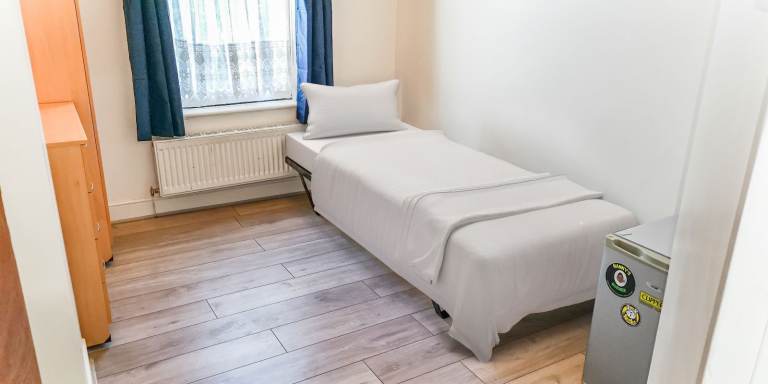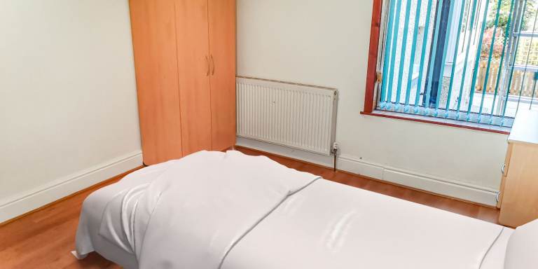 Bedroom with good quality bed, wardrobe, chest of drawers, own fridge in room and all new bedding provided.