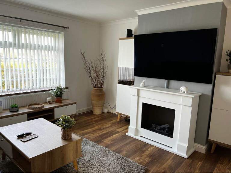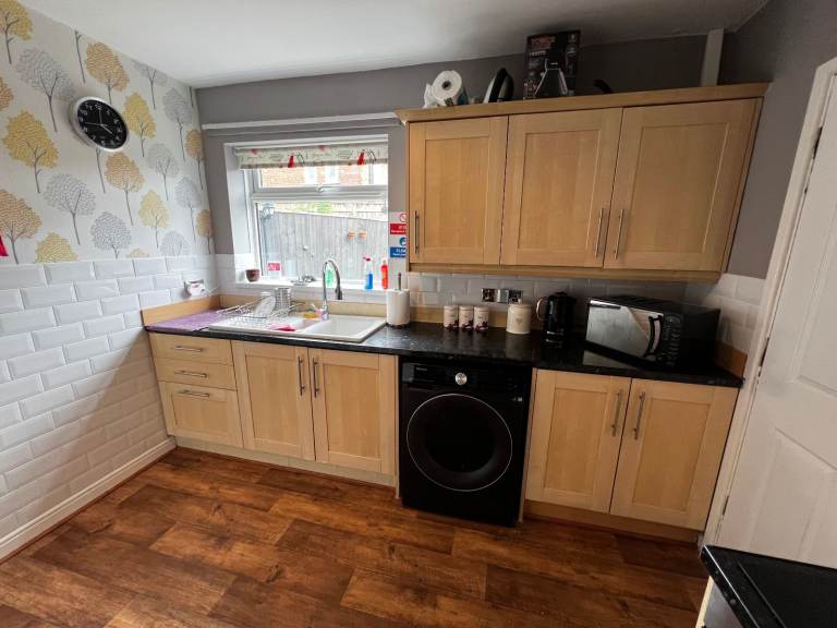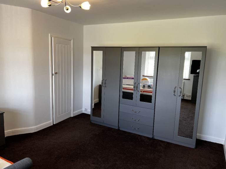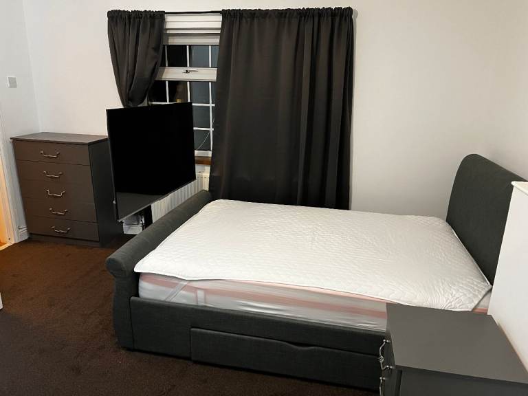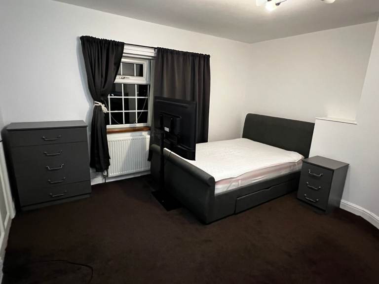 The room comes fully furnished with a new bed including premium memory foam mattress, wardrobe, bedside table, built in wardrobe, and a Smart TV conveniently mounted on a moveable cantilever bracket. The house also features a shared luxury bathroom, large kitchen, and a refurbished living room with a 65” LG Smart TV, including Netflix. We've just added a new American fridge freezer too.