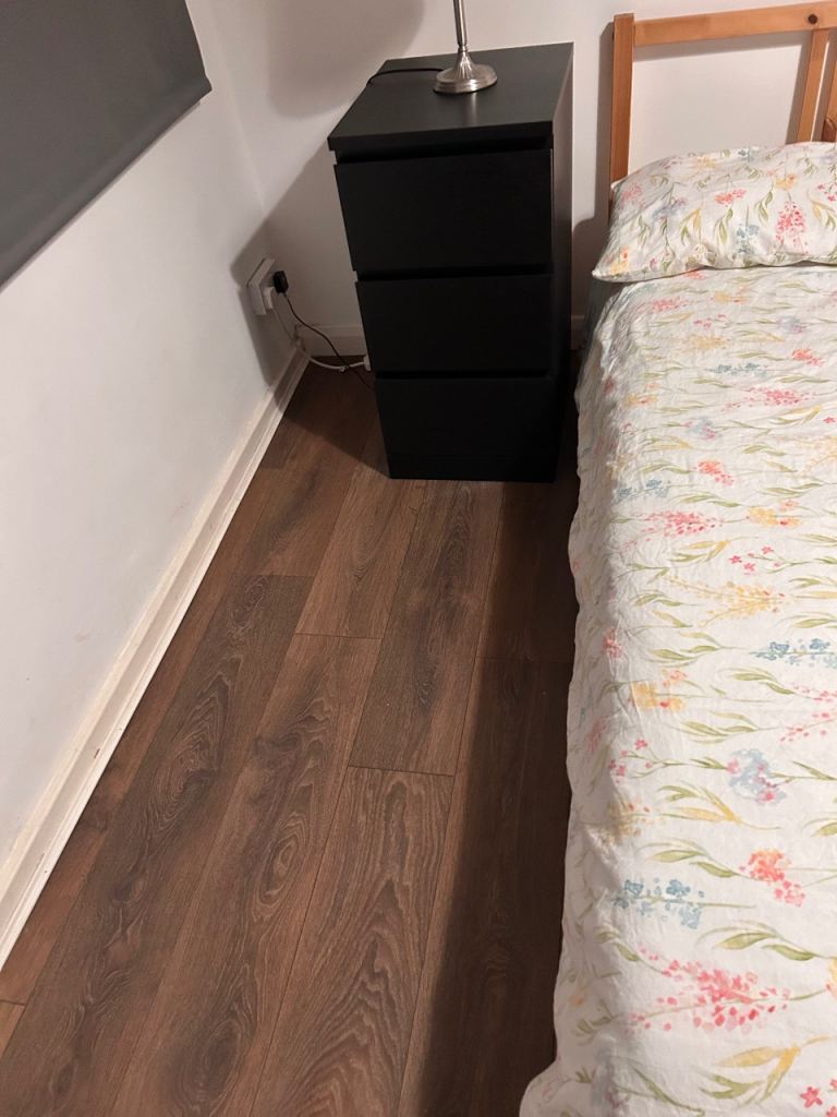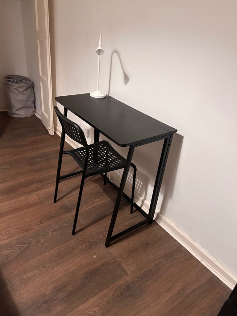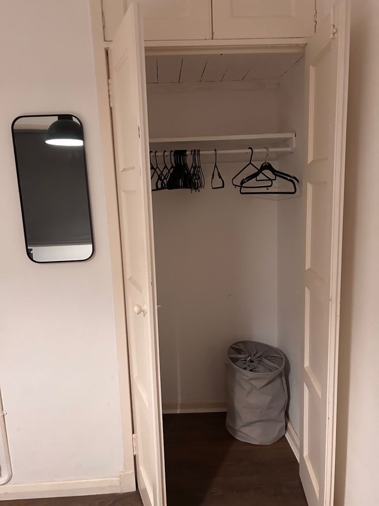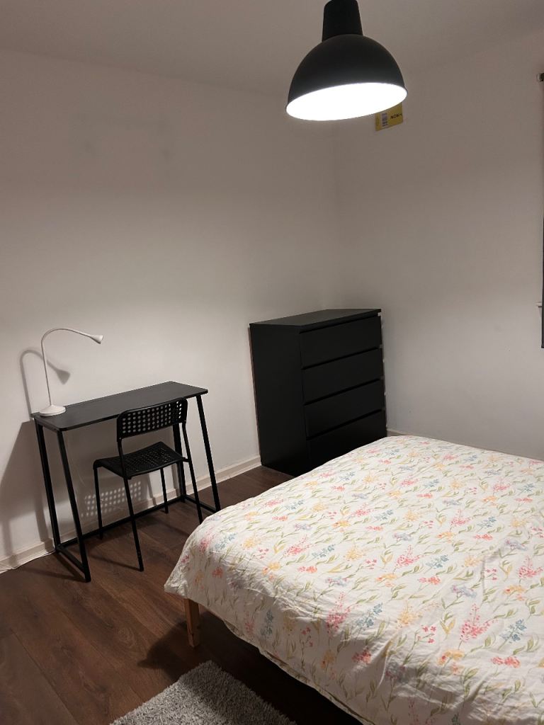 The room is fully furnished and includes a double bed, fitted wardrobe, additional storage wardrobe, and a desk, making it ideal for a professional or student looking for comfort and a peaceful living environment.