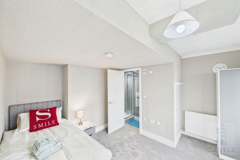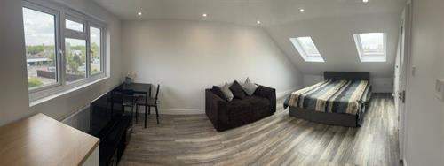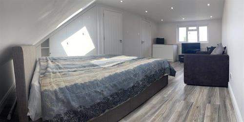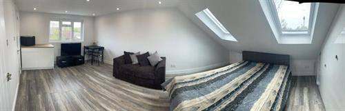 An exceptionally spacious and newly built loft conversion double room with an en-suite. Available as newly furnished with a bed, sofa, kitchen cabinets, kettle, a 14ltr cooler fridge, dining / working table and chairs, a television and wifi. Comes with lots of storage space and wonderful views of the garden.