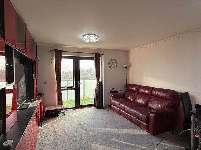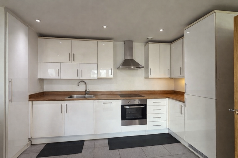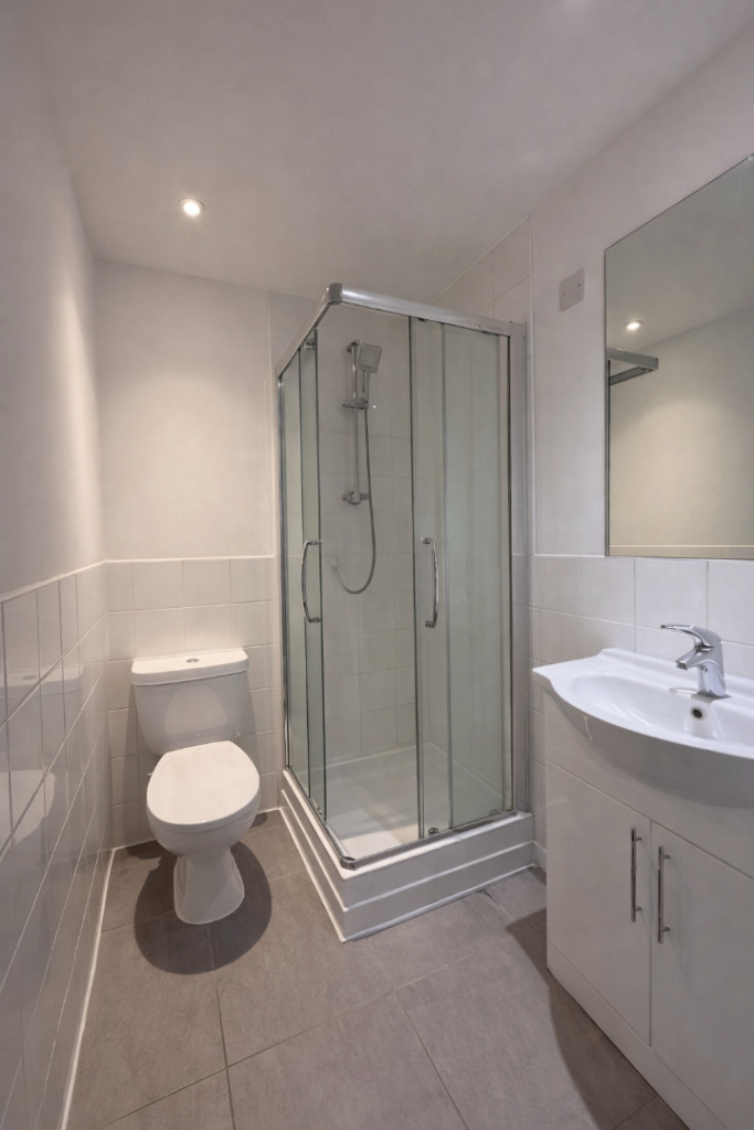 The flat features a fully fitted shared kitchen with a comfortable lounge area, ideal for cooking and unwinding after a long day.
