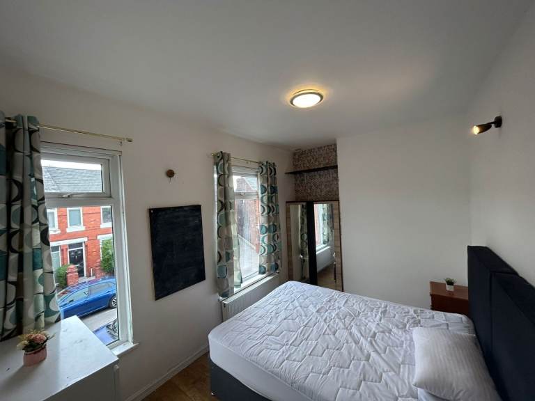 A comfortable and fully furnished double room featuring a large king-size bed for extra comfort. The room is bright, cosy, and ready for you to move in. It comes with essential furniture and storage, offering a peaceful space to relax after a busy day.