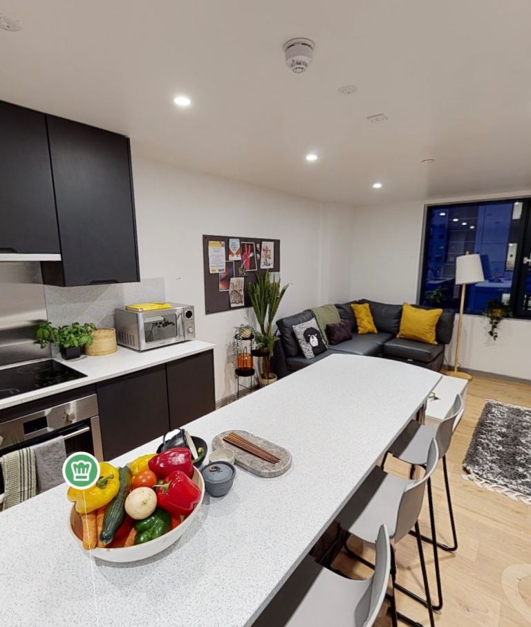 The 4 rooms are each en-suite and share the kitchen facilities. It is on the fifth floor and overlooks Leeds Arena.