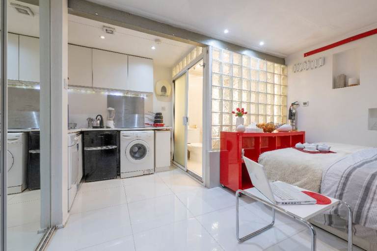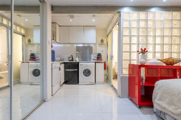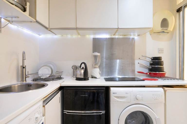 Fully fitted and modern kitchen, with all amenities inc; luding washing machine, dryer. Dining, separate Wet Room and Bedroom areas, fitted mirrored wardrobes and free wifi and Freeview television. Underfloor heating and reactive ventilation.
