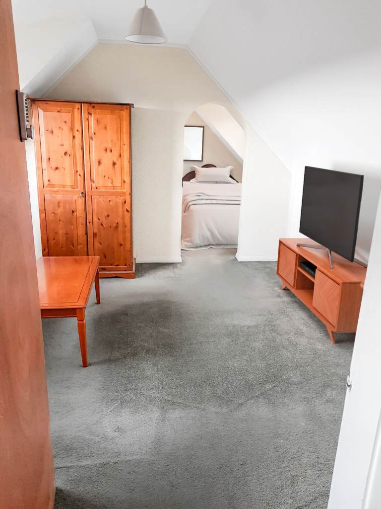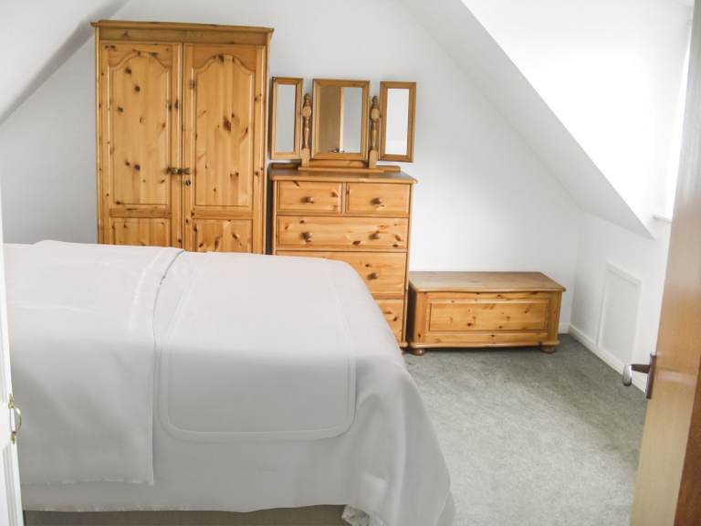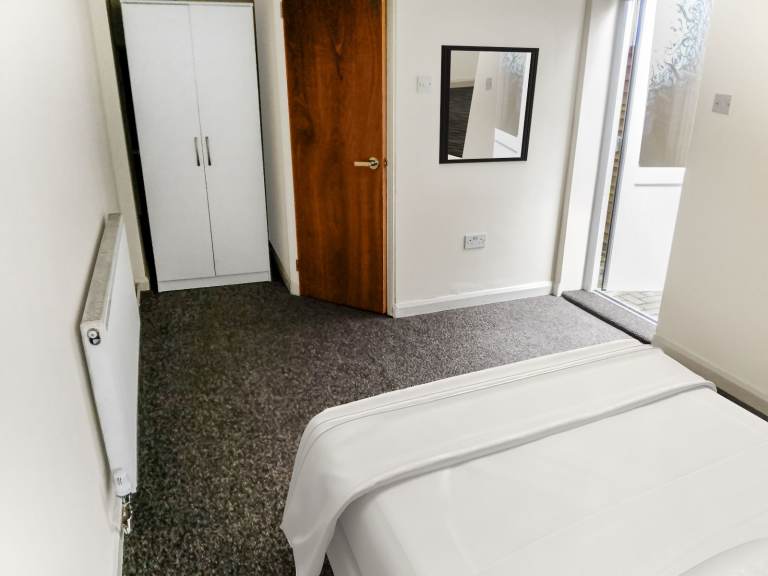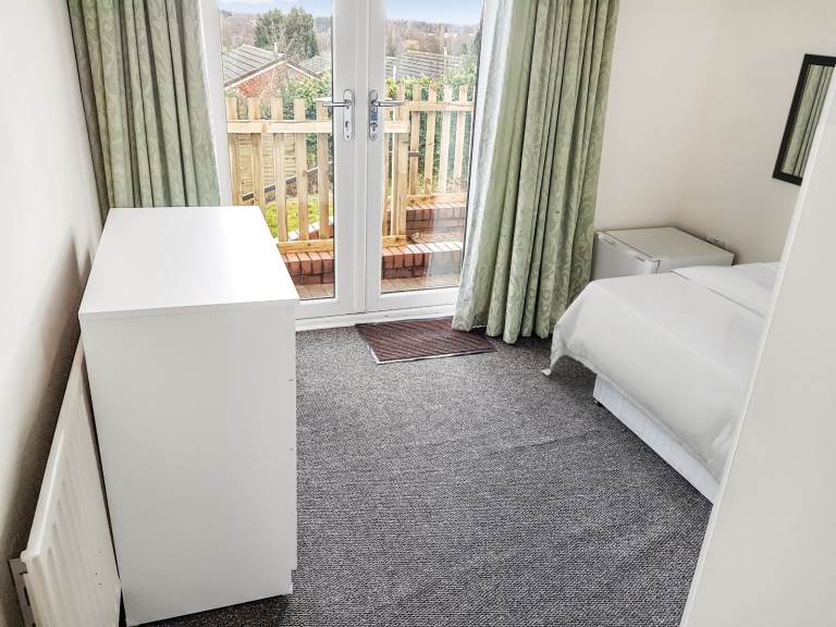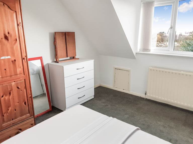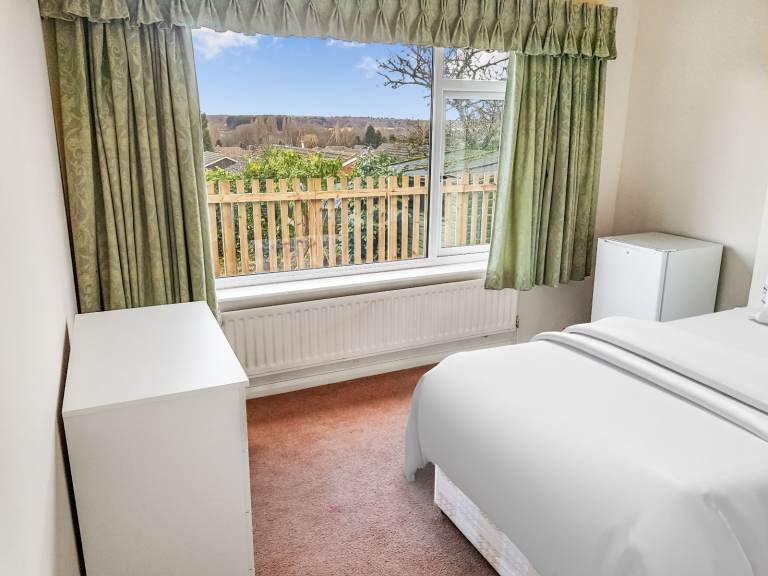 Bedroom with good quality bed, wardrobe, chest of drawers, own fridge in room and all new bedding provided.