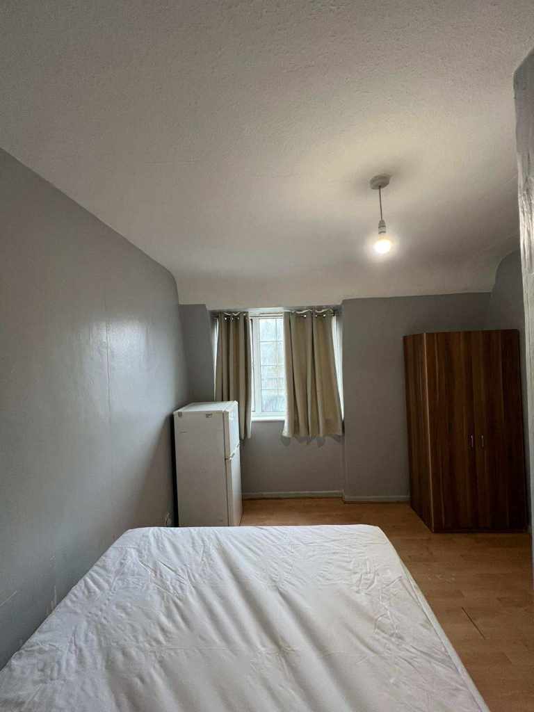 The room is furnished and includes a bed (with mattress protector), wardrobe, and mini-fridge.