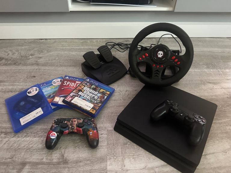 PS4 and controllers are in good condition but does have a few marks here and there as expected with a use unit. Comes with 4 games , charging station for the controllers, power lead and HDMI cable. Low version 10,50