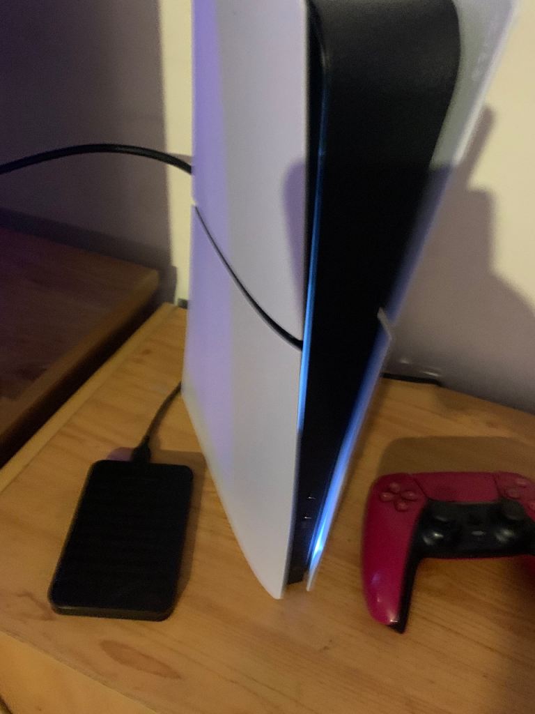 Playstation 5 digital slim edition, comes with 2 controllers, one being the berry red edition, also a 1TB external hard drive to store more games on. upto offers and trades