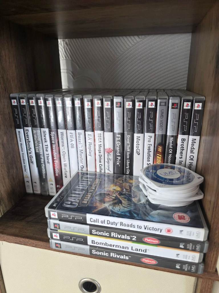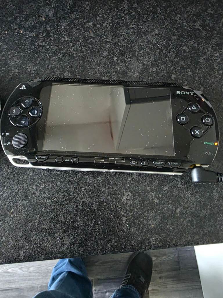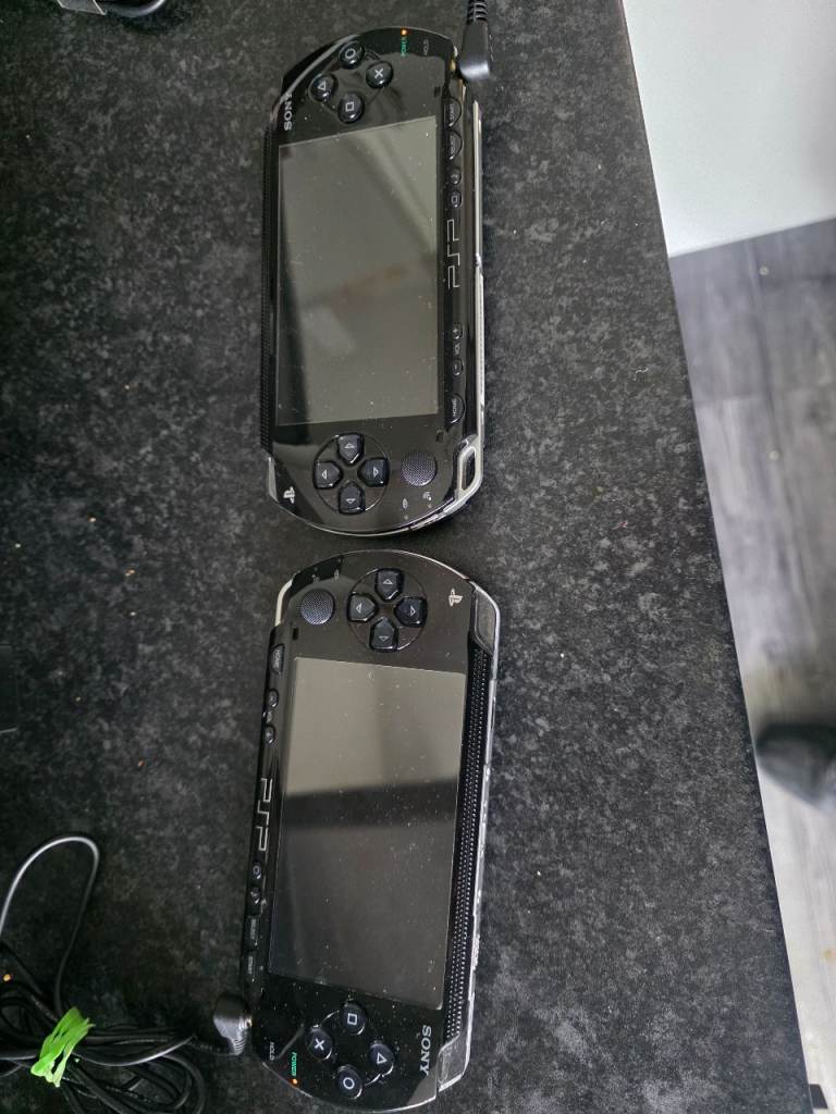 Two like new psp's hand held games consoles come with charger & cases also a veried amount of games & films one with a 28g memory card the other as a 256g memory card collection only