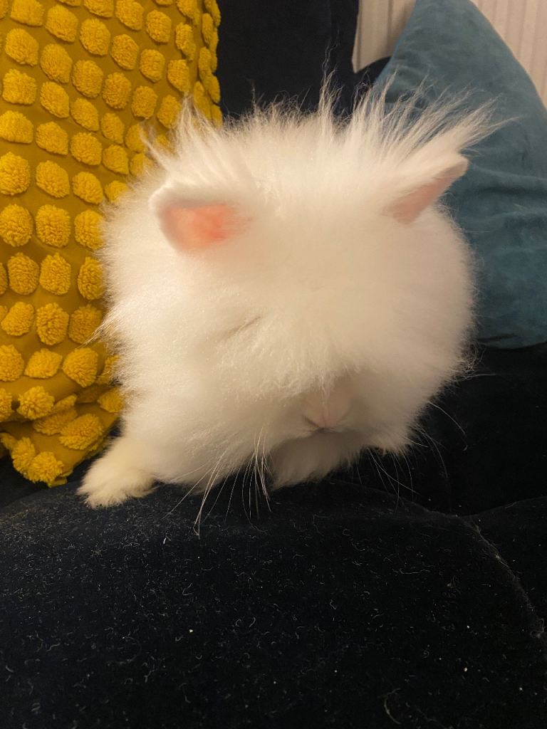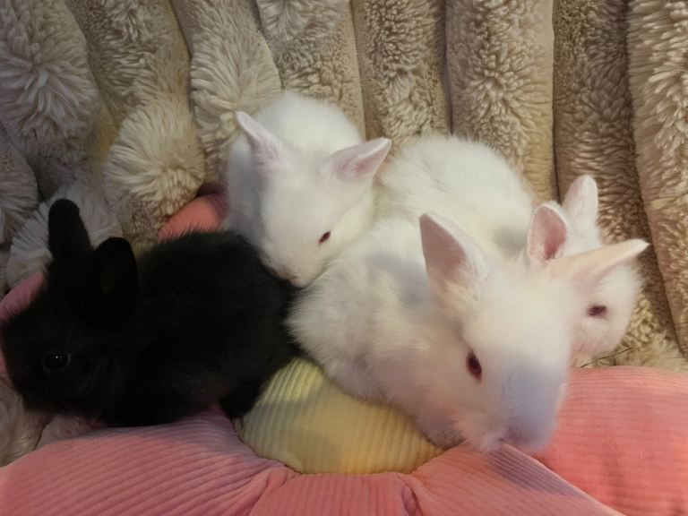 Mum is grey brown mini lions head and dad is white mini teddy bear lop. Grown up with cats and children. Very tame and docile pets.