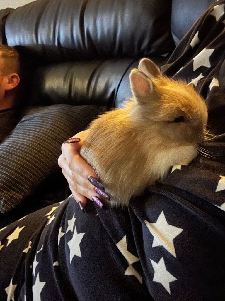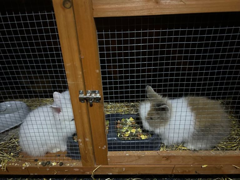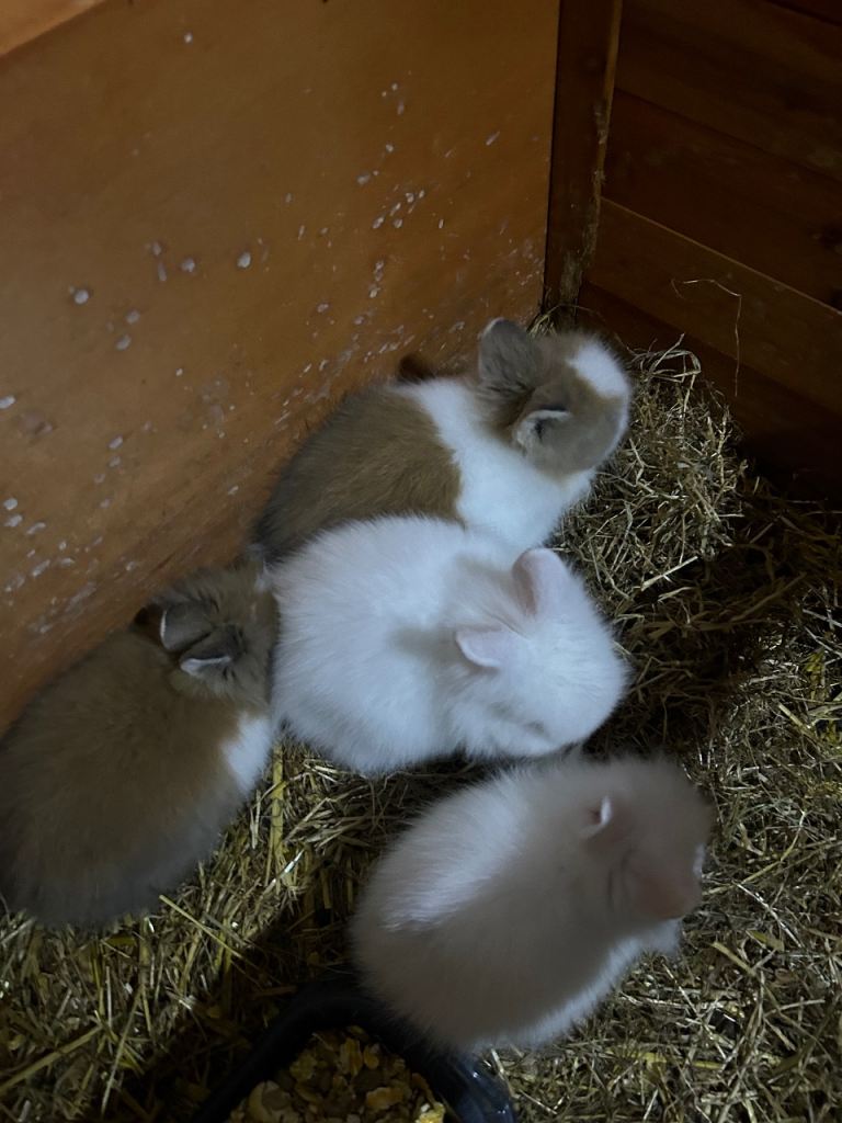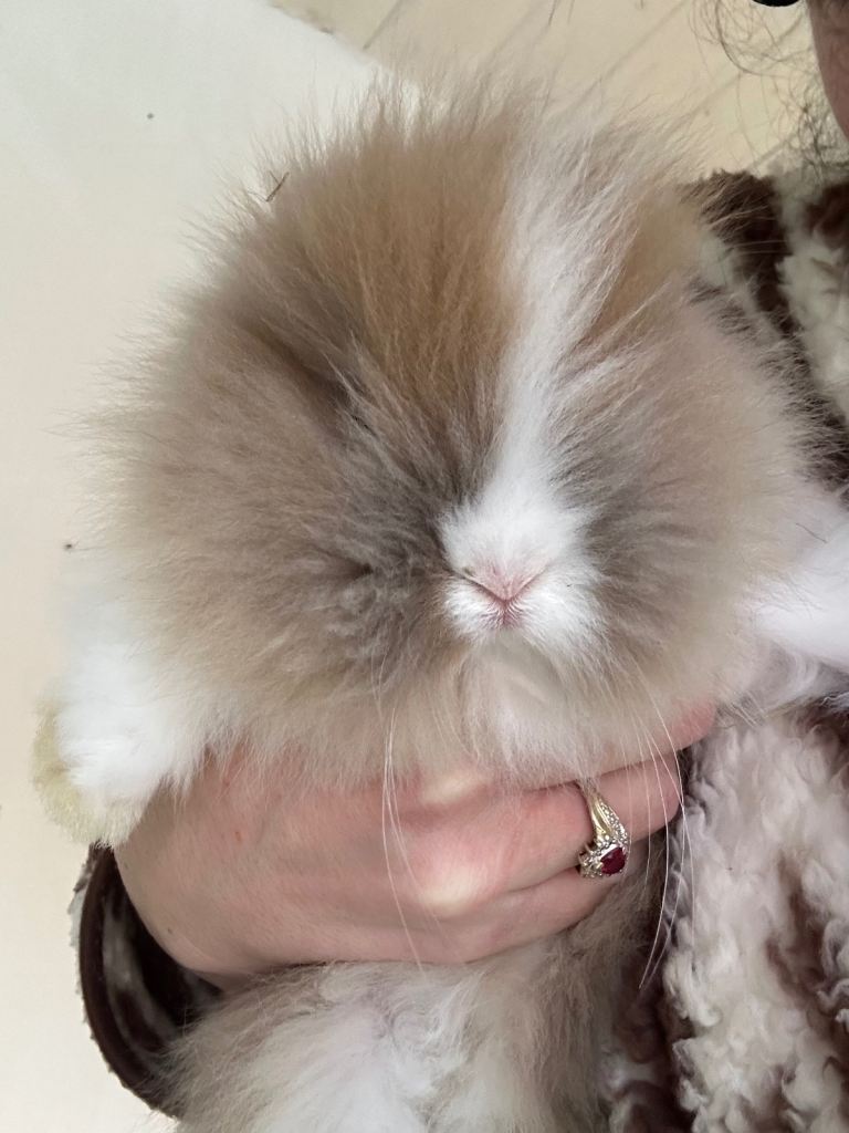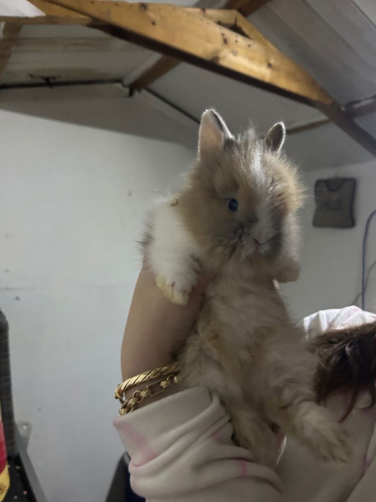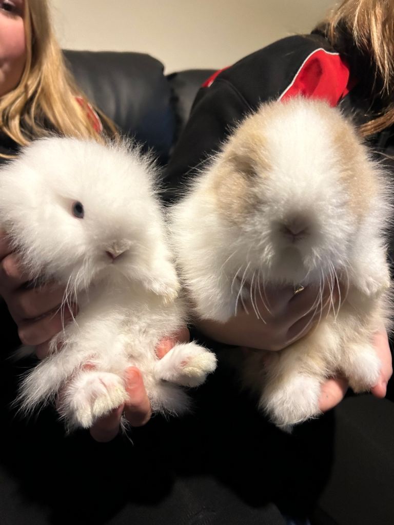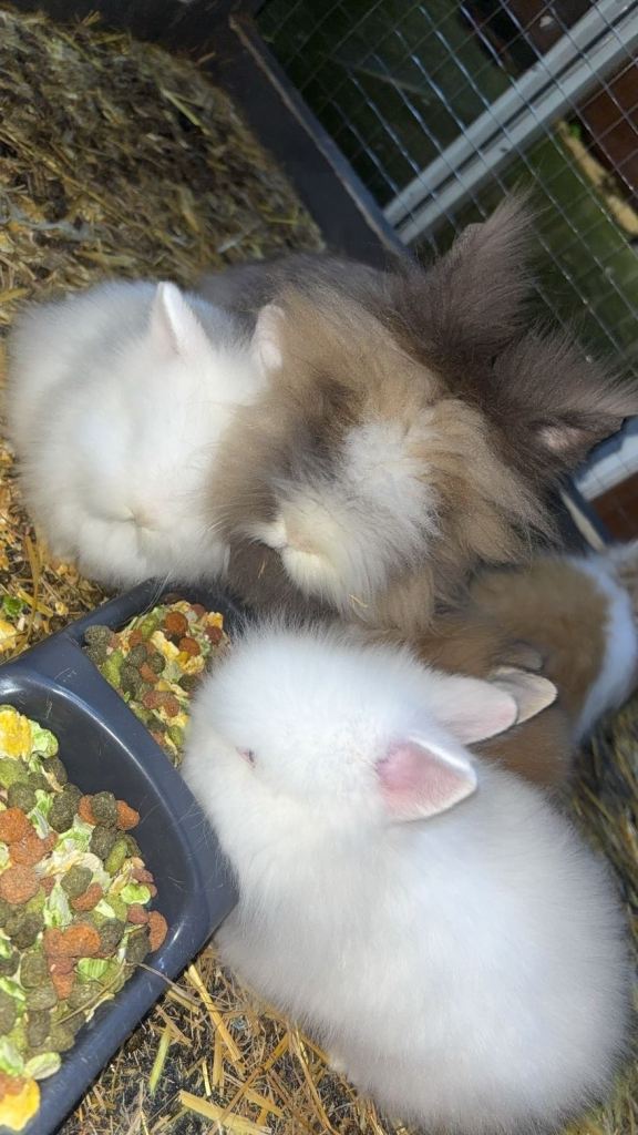 4 beautiful baby lion head rabbits,2 pure white with blue eyes ,1 brown and white,1 brown with white stripe all thieving eating and drinking Independantly beautiful litter both mum and dad can be seen