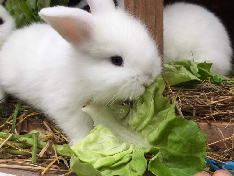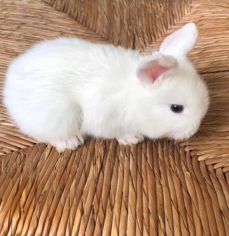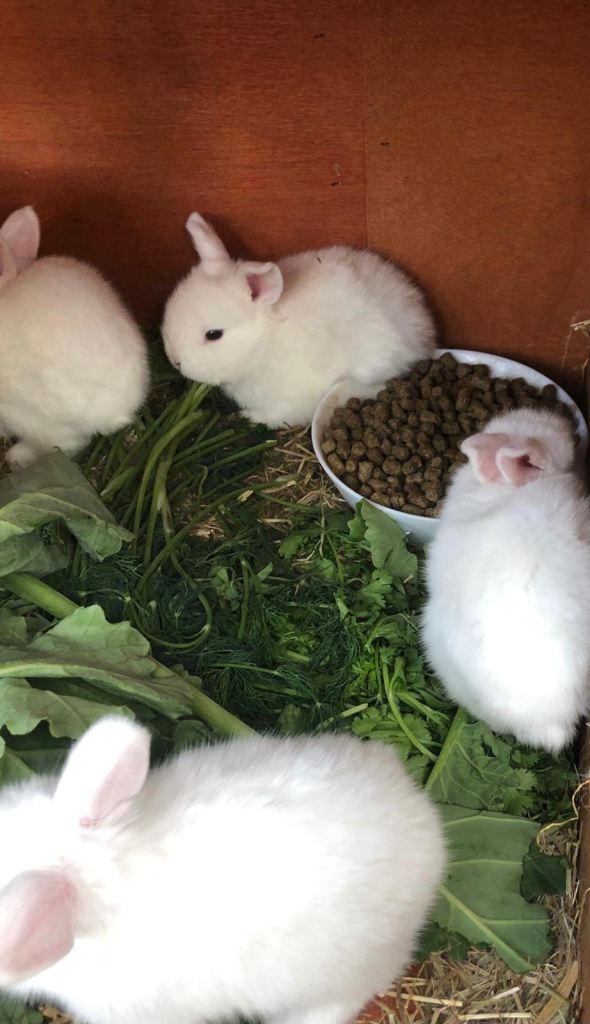 We have some beautiful, friendly baby rabbits available for sale. These little ones have stunning blue eyes and soft white fur. They are very gentle, love cuddles, and are great with children—no biting or scratching!