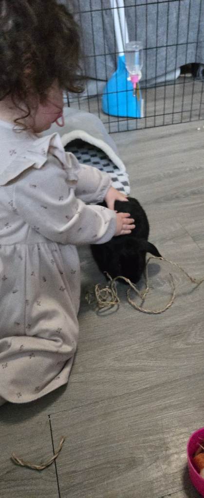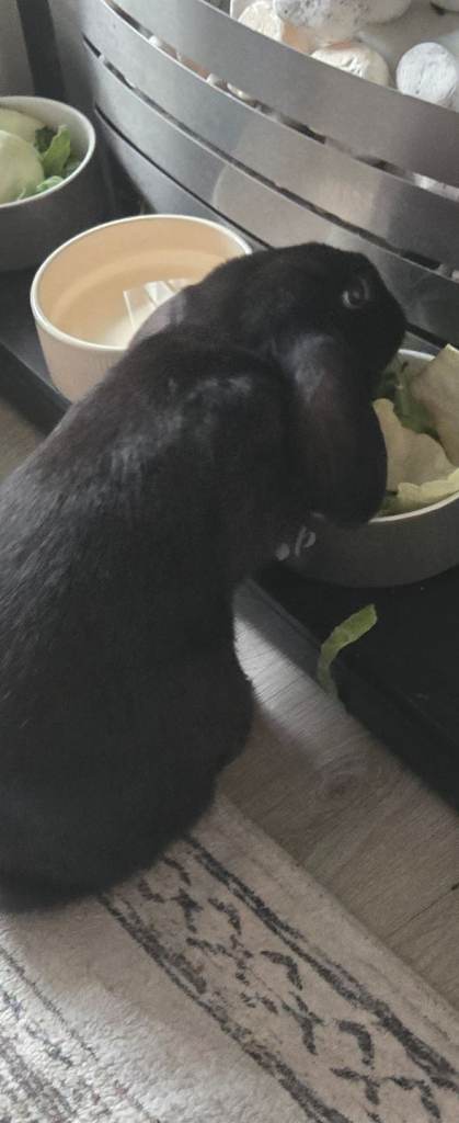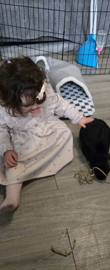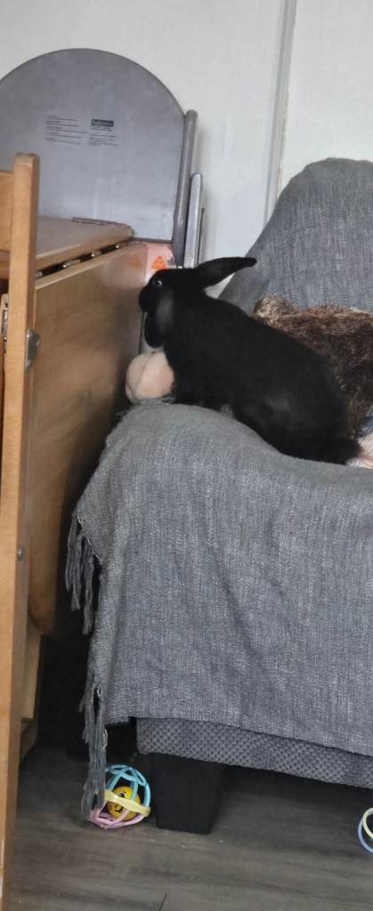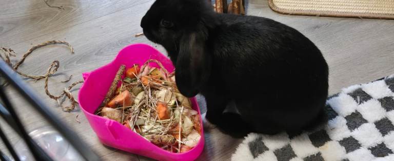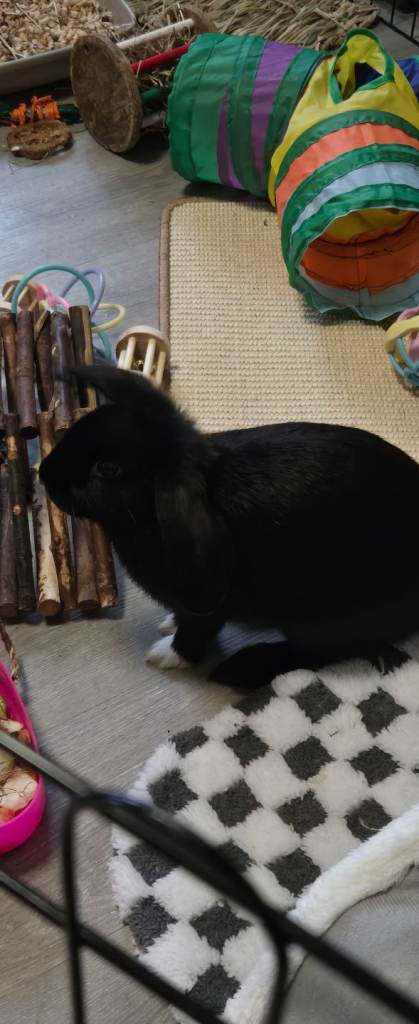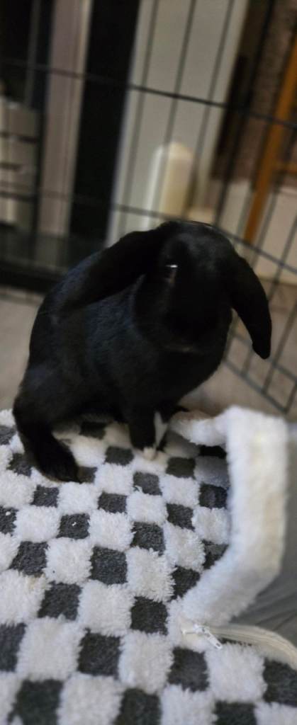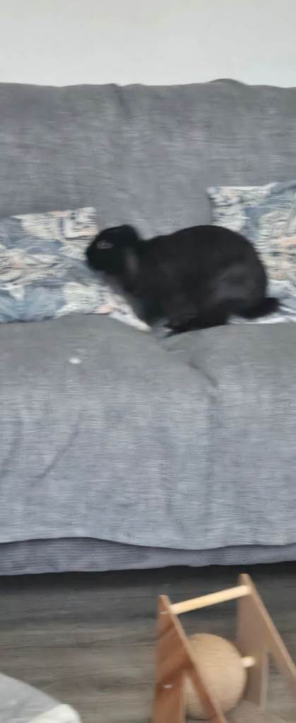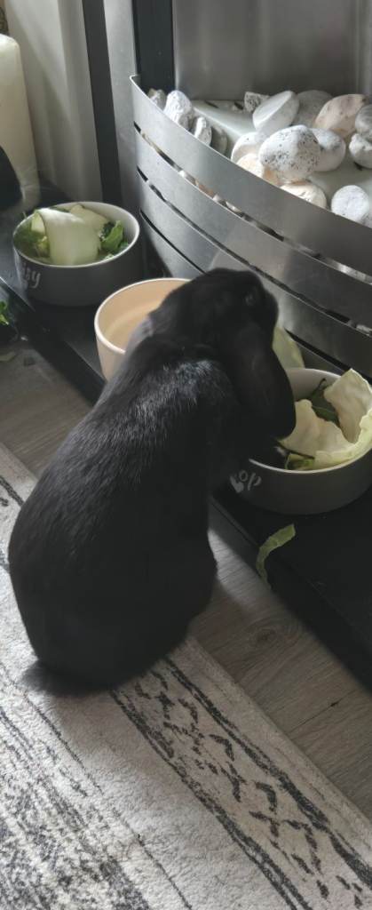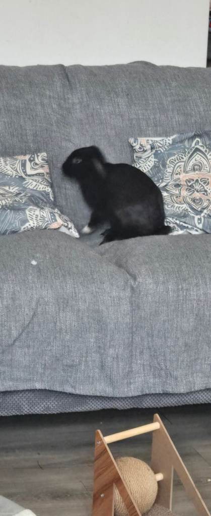 Flop is 15 weeks old very nearly litter trained defiantly urinates in his litter tray but has the odd soild outside of it but always near. Is free roaming of the day bit does spend nights in the two storey hutch outside. Recently found out my daughter is allergic to rabbits so cant keep him is bonded to his sister but she has a home waiting. so quite urgent as my daughter cant be around him comes woth his personalised food bowl can include indoor cage (i had for really bad weather and everything in it. Hes not spayed