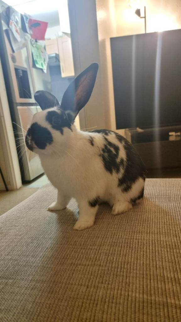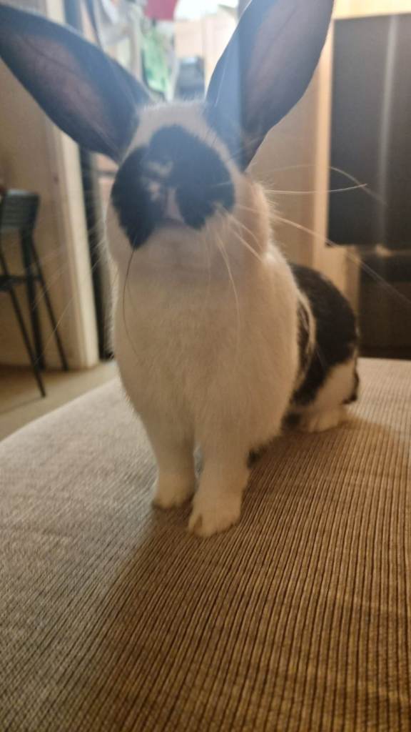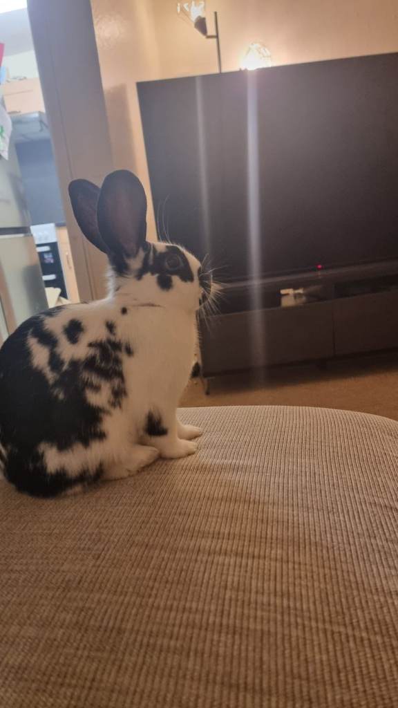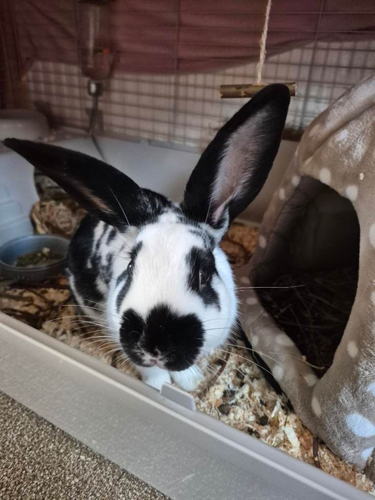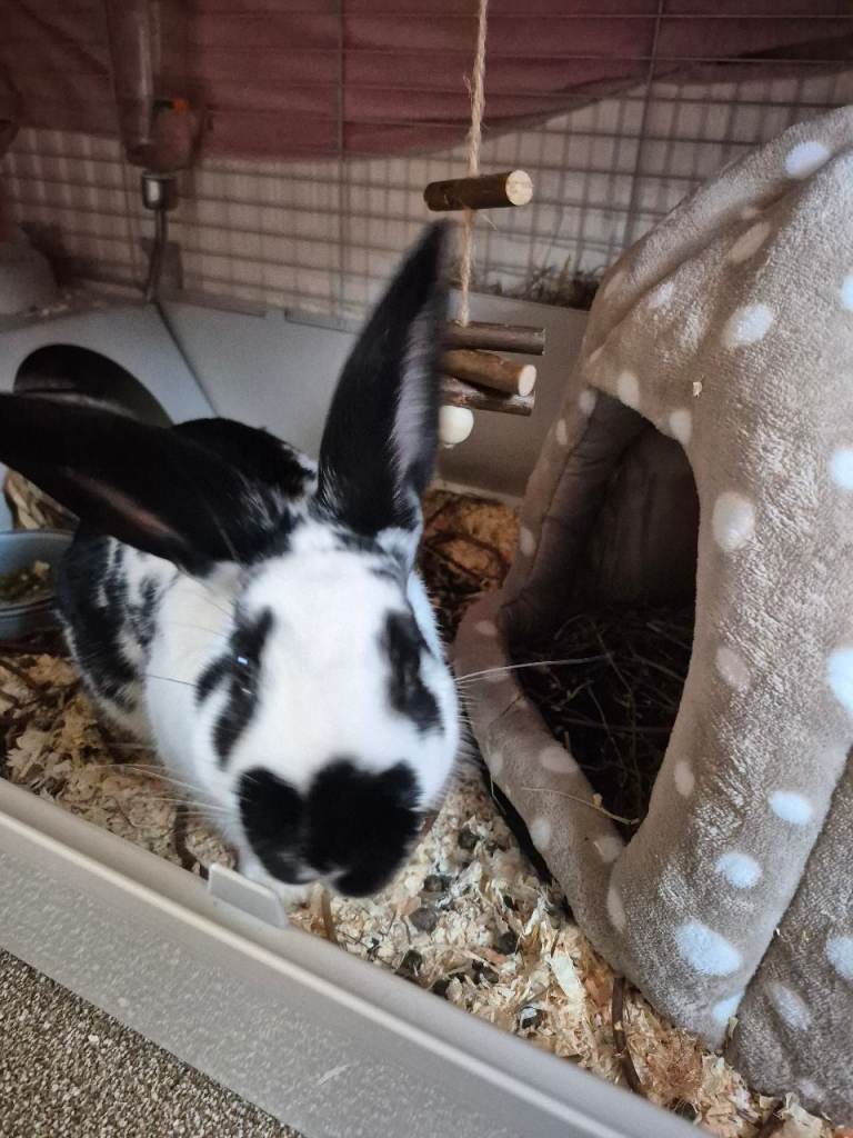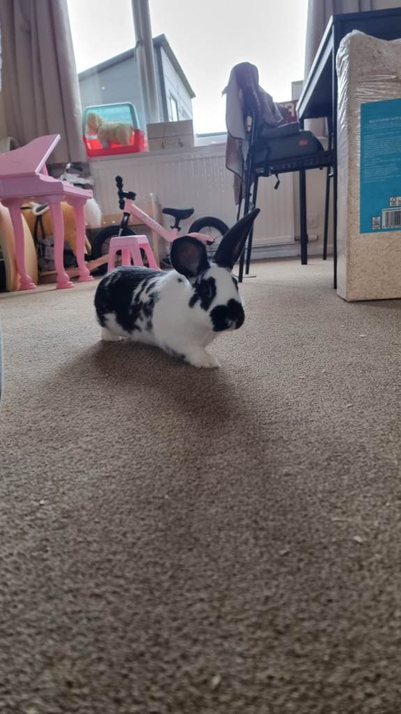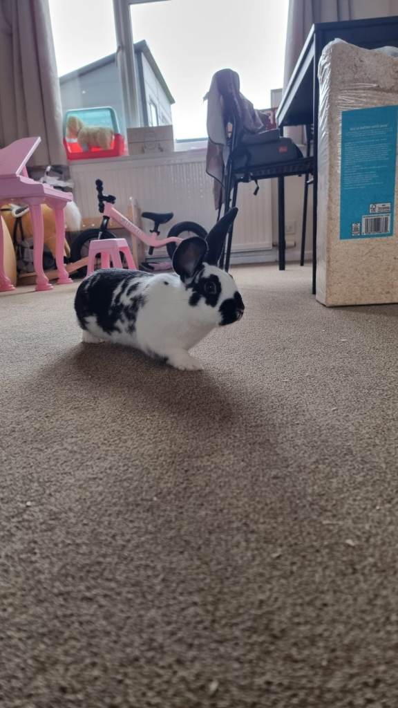 Max is a checkered giant cross breed 4 months old. Good temperature loves to run and jump in the day and chill watching Downton Abbey in the evening. Unfortunately we can't give him the love and care he deserves, because of busy work and weekends. Comes with everything you need. Hutch, bed, straw, sawdust, toys, chews, treats, food if it's not used up by the time you buy him. Cost us £250 all in, looking £175.