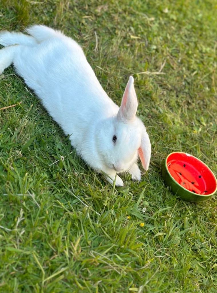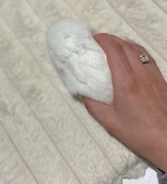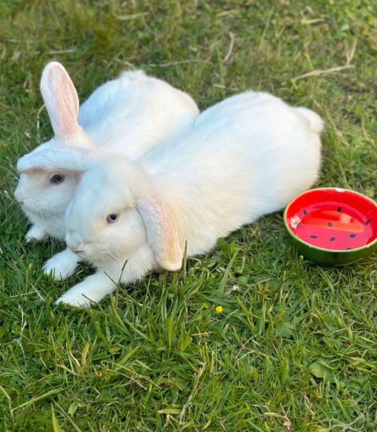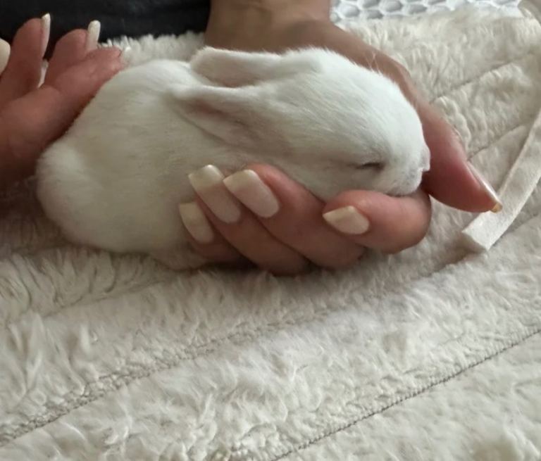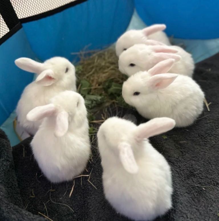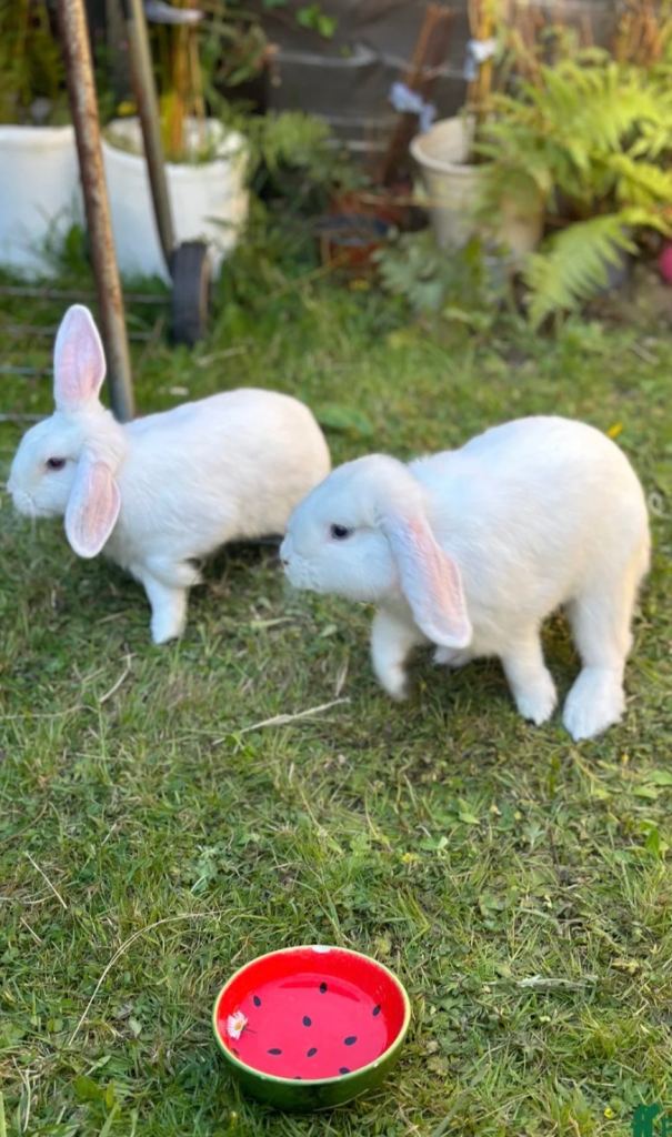We have 1 baby boy and 1 baby girl left! They are all stunning white with blue eyes like their mum and dad. They are so friendly and adorable; truly beautiful little bunnies with a lovely kind nature like their mum and dad.