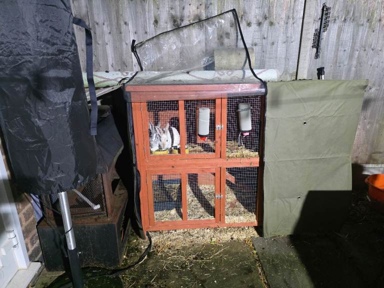 Two mini rex female rabbits with hutch weather cover hay straw food water bottles full set up