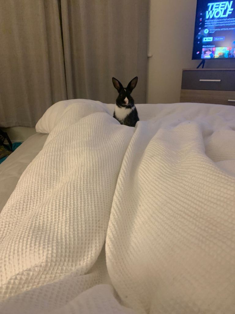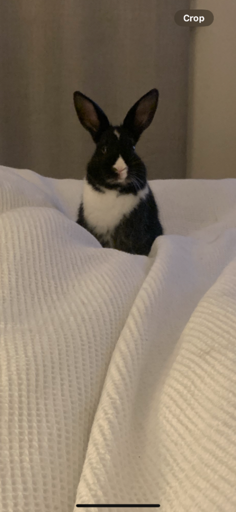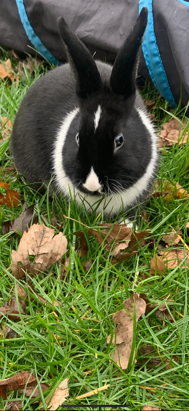 Betty currently lives outdoors in a play house with connecting tunnel. She’s litter box trained, ideal indoors or out as she’s happy in either. Unfortunately she is a mass cheeky chewer. So if she is to be kept as a house bunny lots and lots of bunny proofing needed.