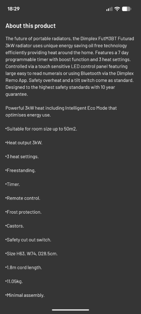 Features 3 heat settings, a 7-day programmable timer, and remote control via Bluetooth.