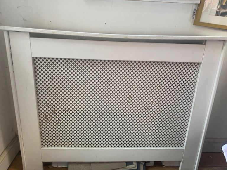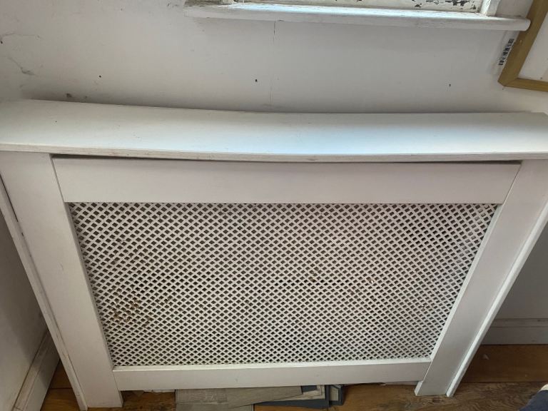 Radiator cover white slight marks here and there and top slight dip. Can be painted and given a new lease of life. Height 36” length 47” width 8” . Collection only