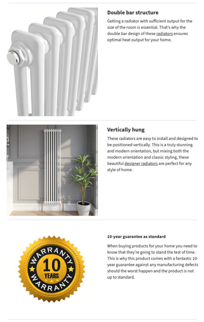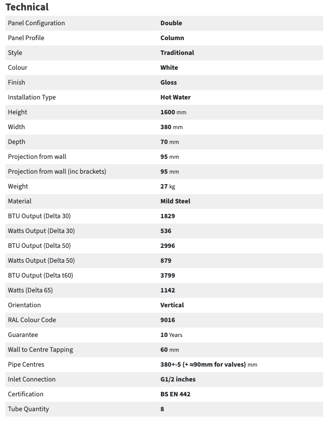 This 1600 X 380mm Park Lane Traditional Vertical Colosseum Double Bar Column Radiator in white is surplus to requirements from a recent refurb project, unused and unopened. Retailing at £149, a bargain at just £90. Specification located in attached images.