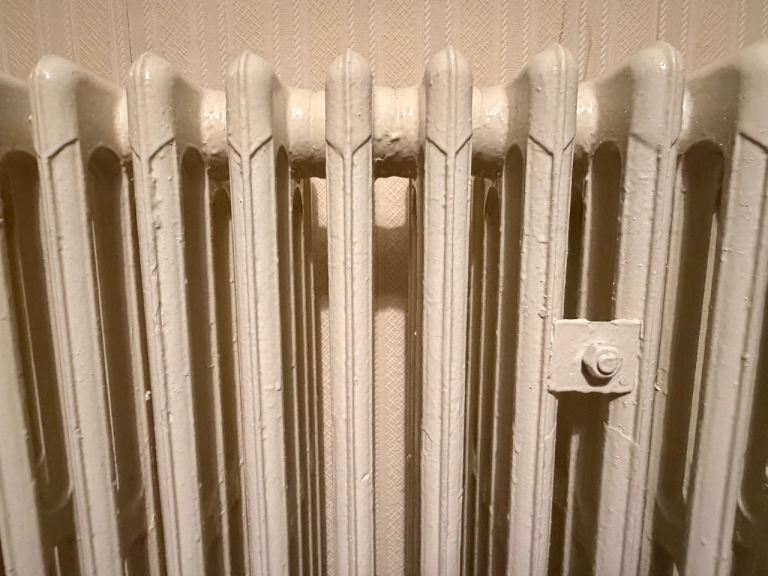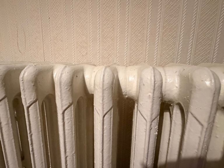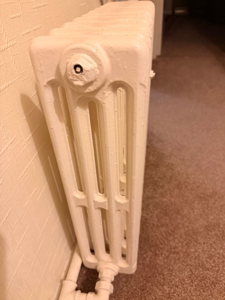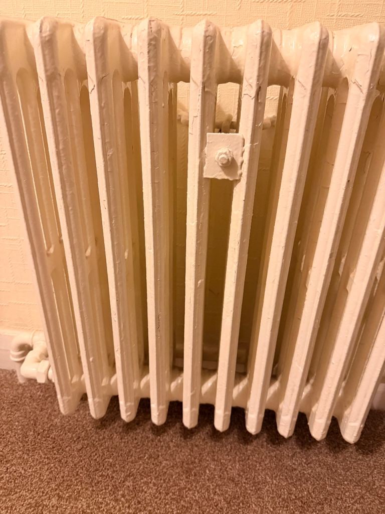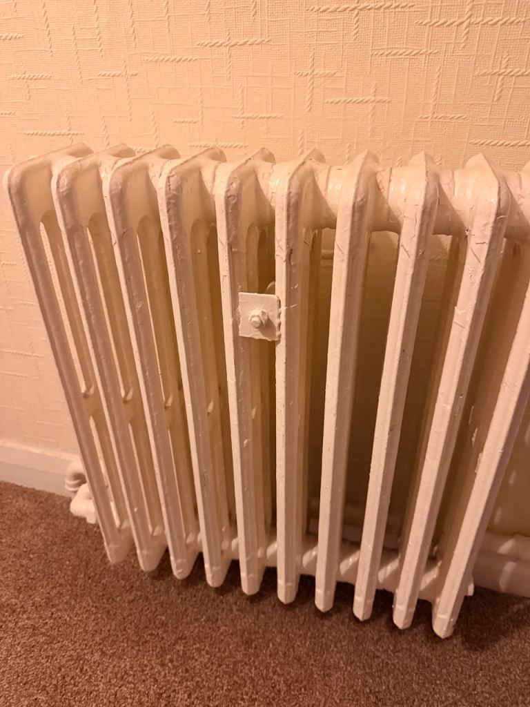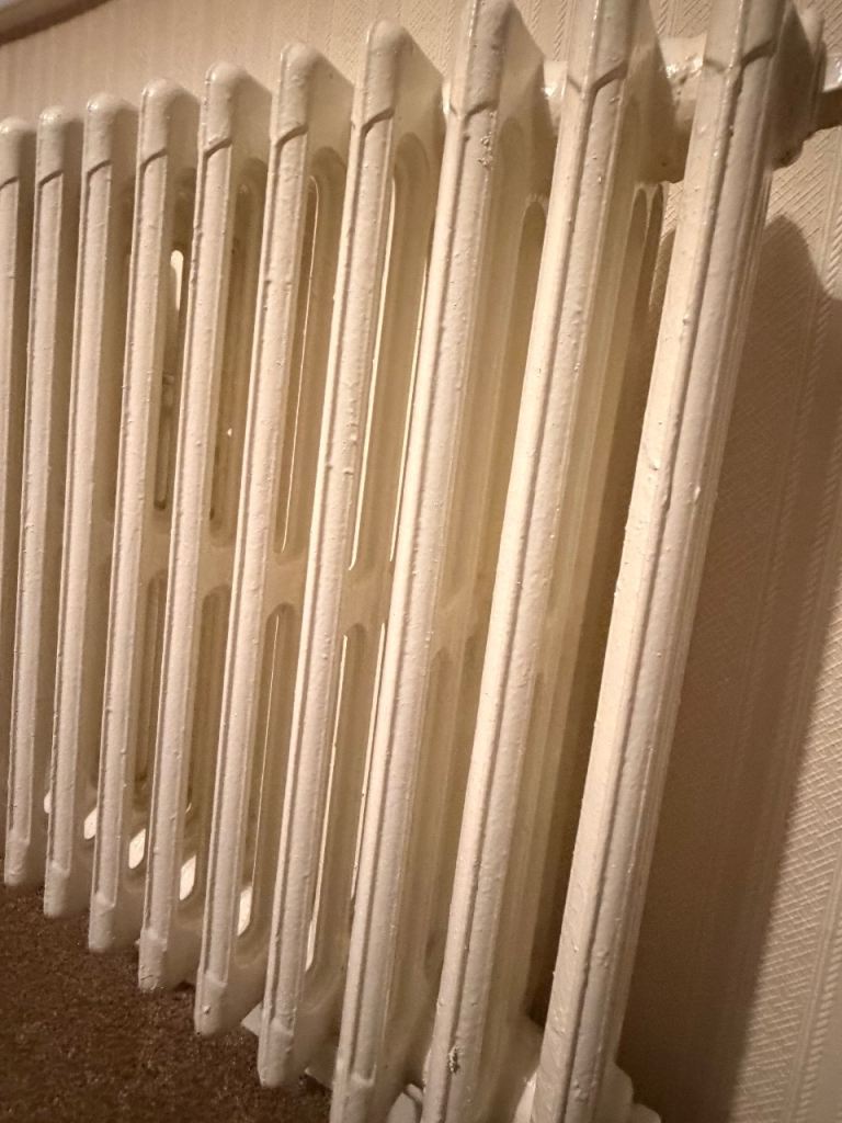 Traditional cast iron radiators in good working condition, painted in a neutral cream/off-white. Classic column design with excellent heat retention—ideal for period homes or renovation projects.