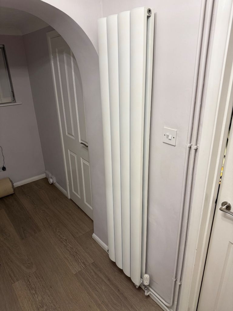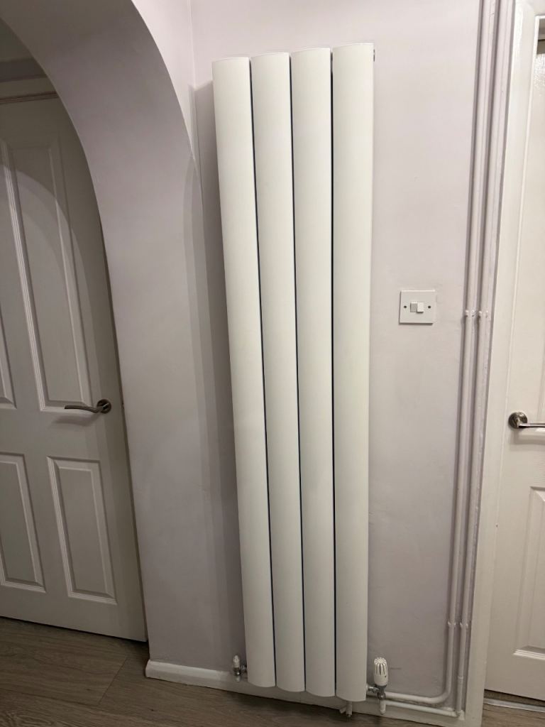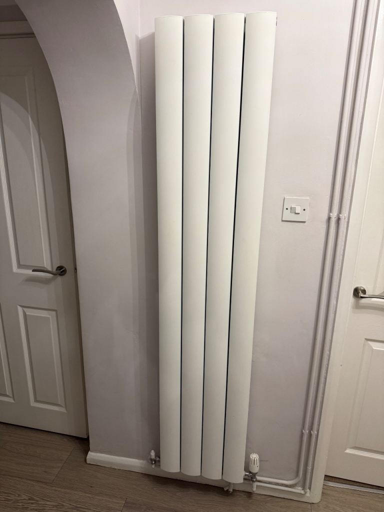 A designer double radiator in white 38 cm wide by 180 cm high. In very good condition . Valves included .