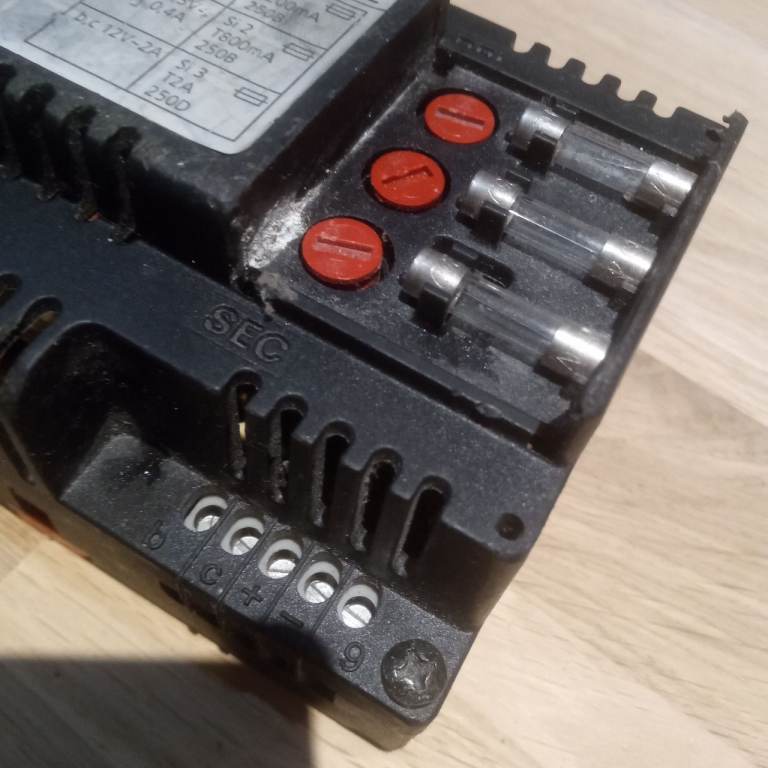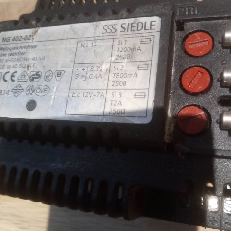 The Siedle NG 402-02 is a 230 V mains rectifier and transformer designed to power intercom systems, delivering 8.3 V DC (0.4 A) and 12 V AC (2 A). It features replaceable, externally accessible fuses, LED status indicators, and regulated DC voltage, offering improvements over older models.