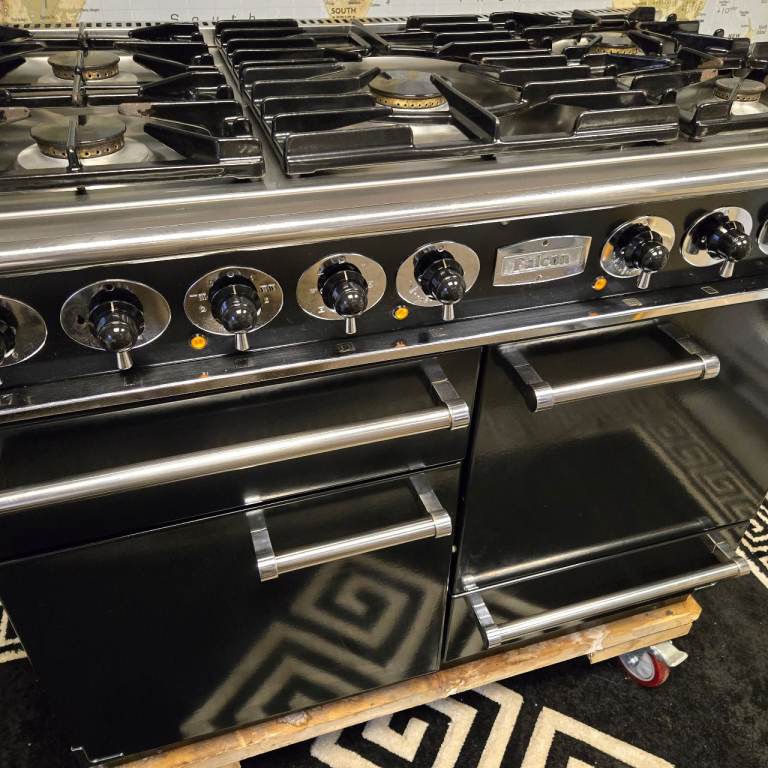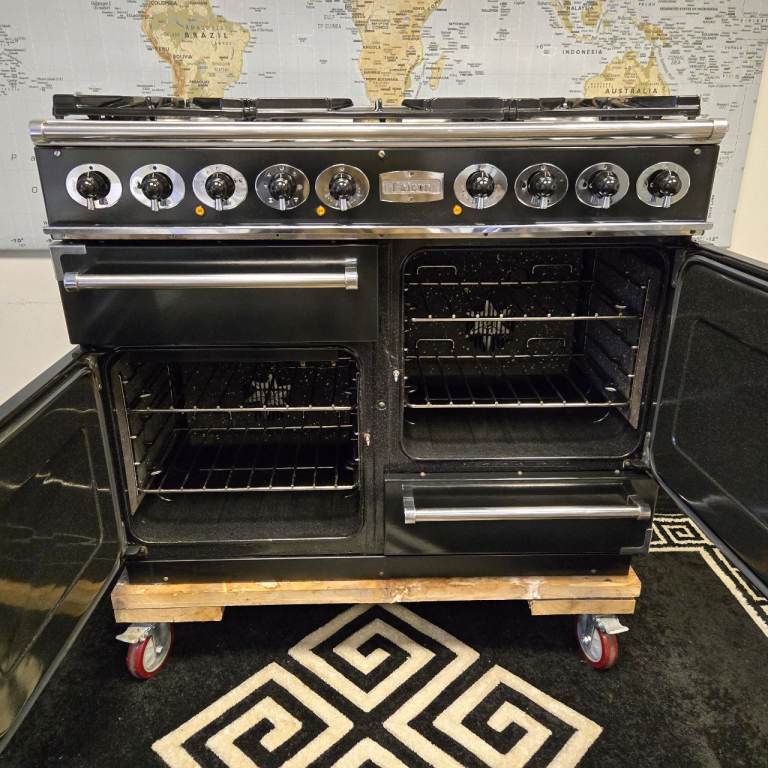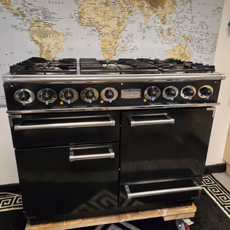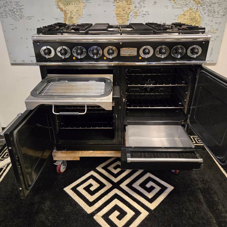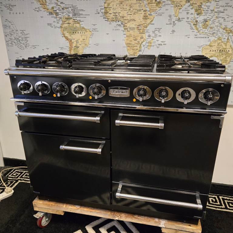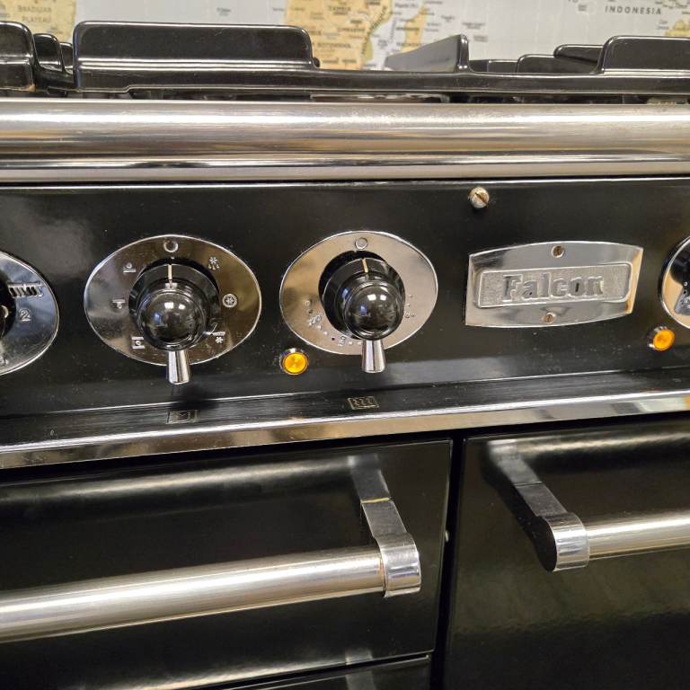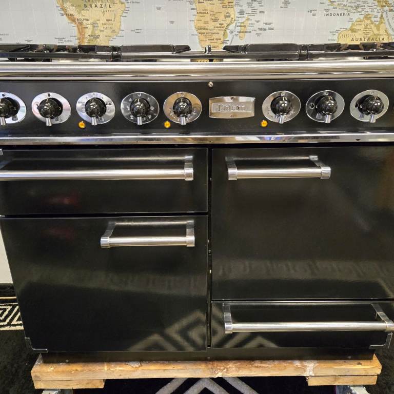 Falcon Deluxe 1092 Dual Fuel Range Cooker in Black with a Chrome Trim and 110cm wide.
