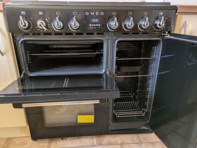 Smeg BM93BL range cooker, 90cm wide. 8 years old and in excellent condition, replaced due to complete kitchen refit. Hob has five gas burners, two independent electric fan ovens and separate electric grill. The closest equivalent today is the Smeg Concert 90cm three cavity dual fuel range cooker, priced at £1,699 direct from the manufacturer, hence the suggested price. A-rated for energy efficiency. Already disconnected and available for immediate collection.