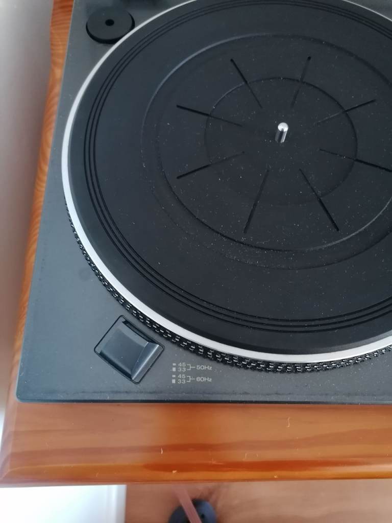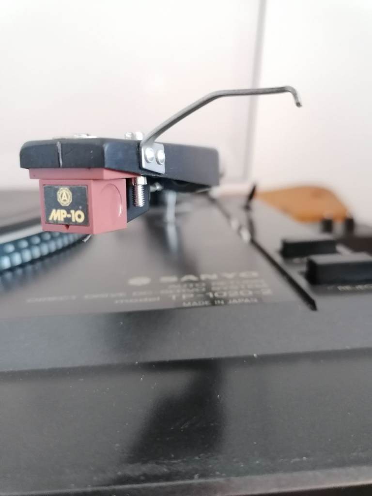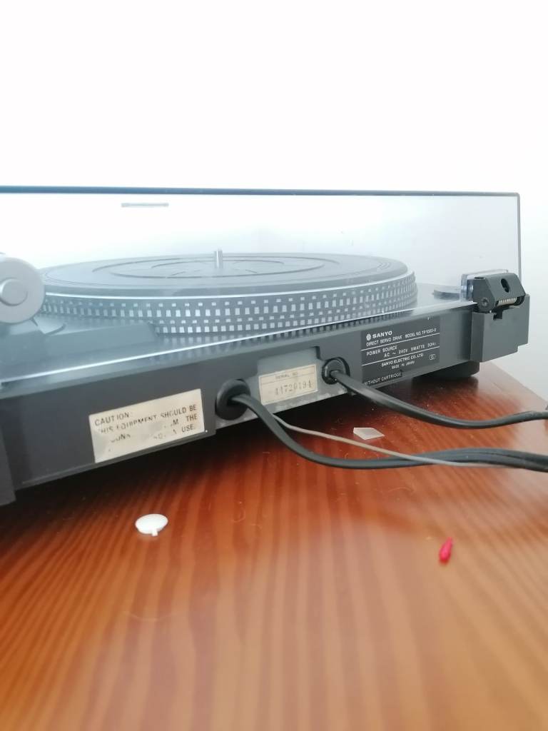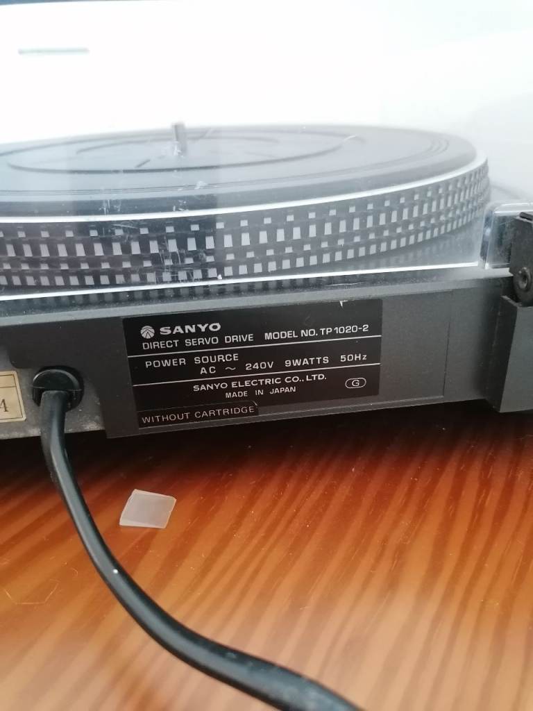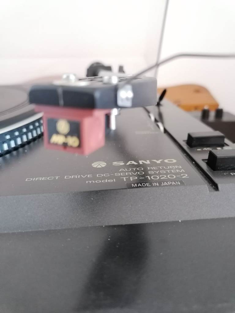 Classic vintage Sanyo TP-1020-2 direct drive turntable, featuring a reliable DC-servo motor and convenient auto-return function. This setup also includes a phono turntable preamp, making it easy to connect to modern amplifiers or speakers without a dedicated phono input.