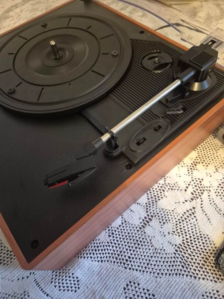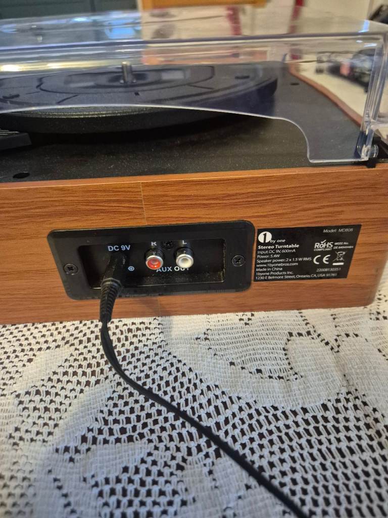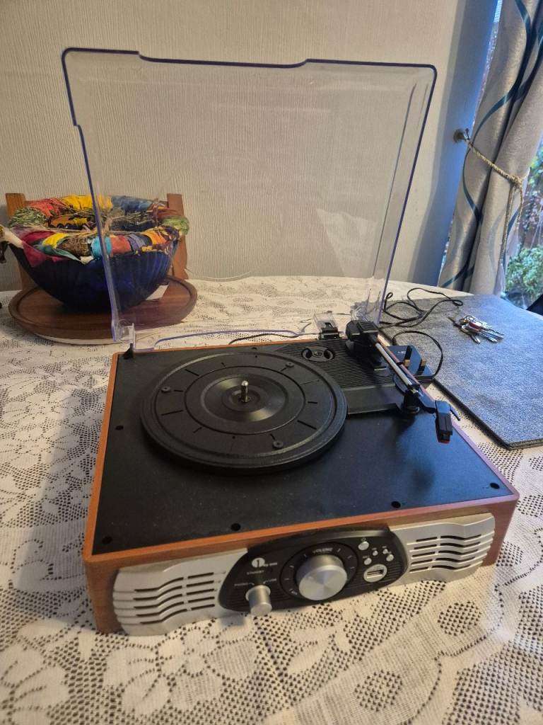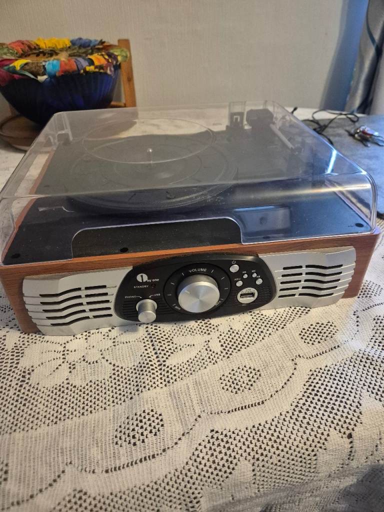 1 by One stereo turntable, built in speakers. Additional speakers can be attached. Ideal for your vinyl. From a spfh.
