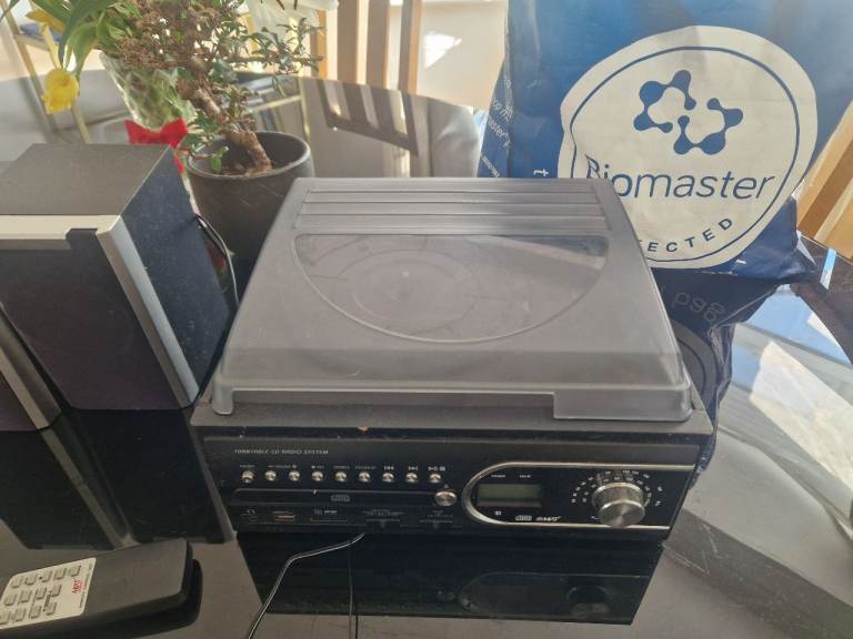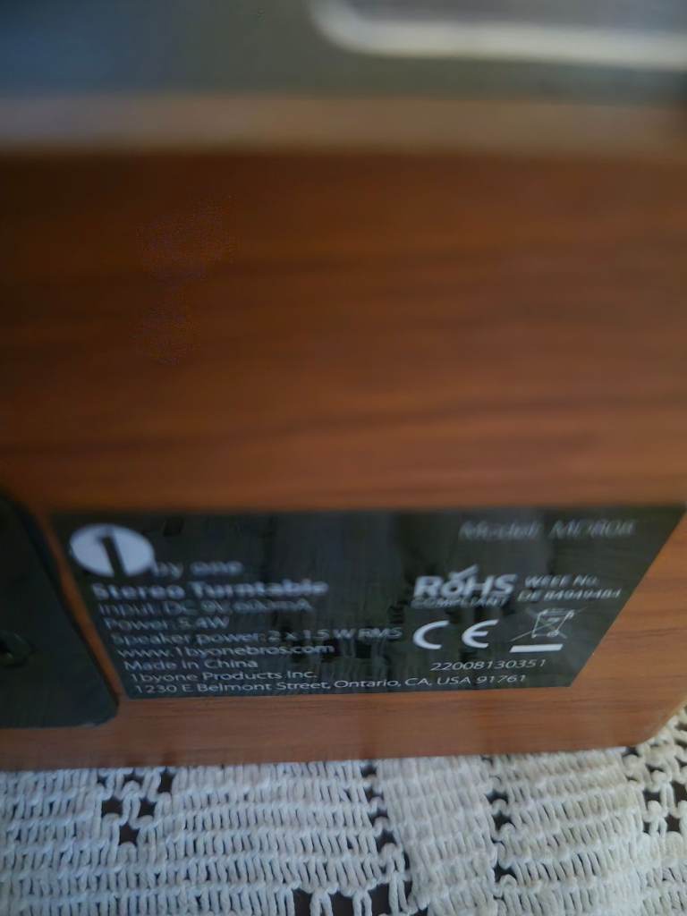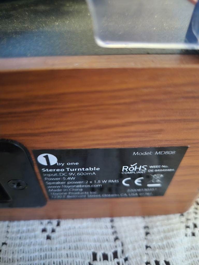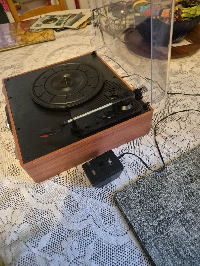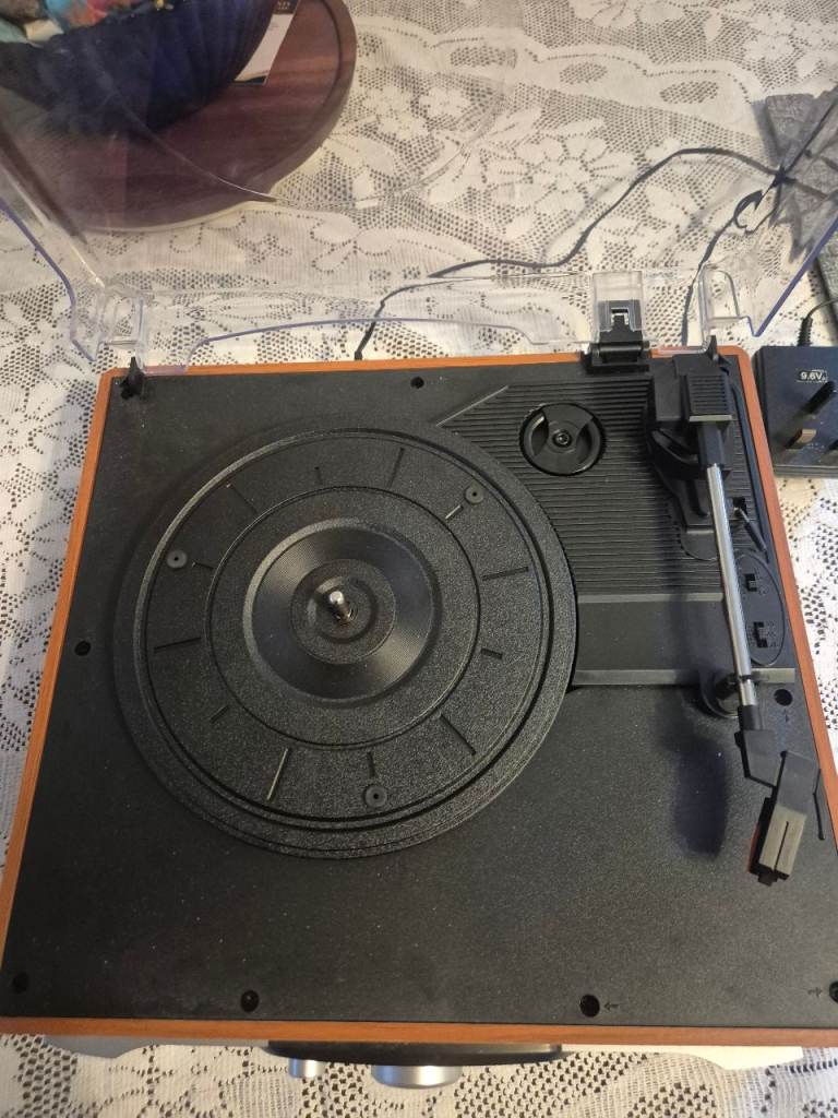 1 by One stereo turntable, built in speakers. Additional speakers can be attached. Ideal for your vinyl. From a spfh.