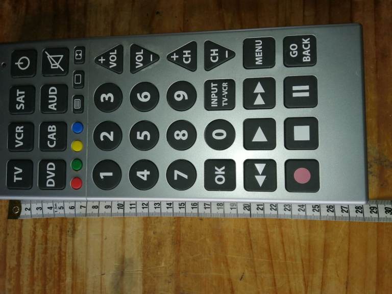 The Jumbo Universal Television TV Remote Control features large buttons in a sleek silver design. This giant oversize remote is compatible with most universal television brands and models, offering a convenient wireless range for easy control. The unit is sold individually and provides a user-friendly interface for navigating your TV and home entertainment system with ease.