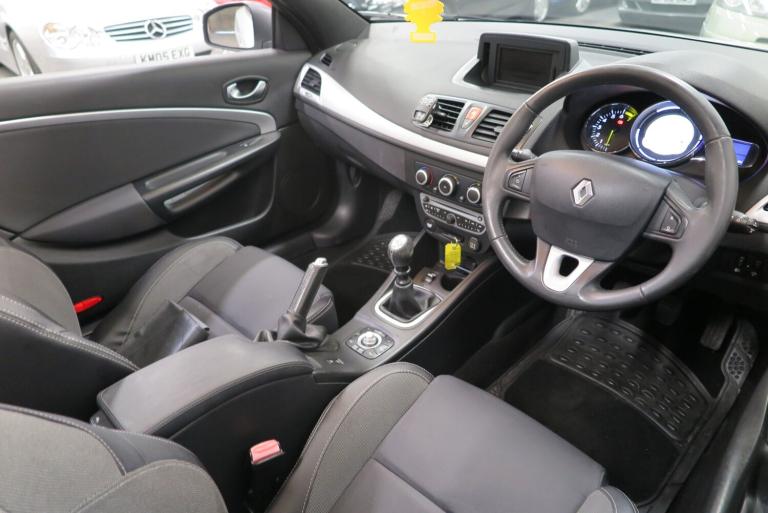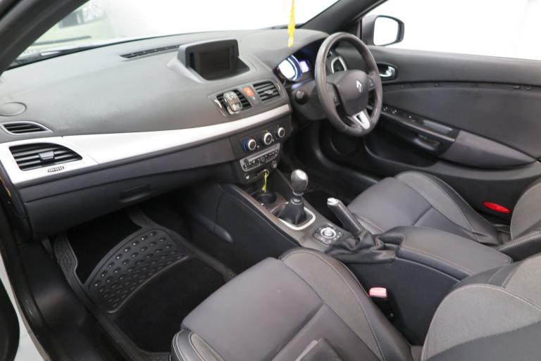 'Guide me home' headlamps,'Smart' windscreen wipers,12V Accessory socket,3 point seatbelts on all seats,ABS + EBD + EBA,Adjustable dashboard illumination,Air recirculation system,Aluminium kick plate,Anti submarining airbag on front seats,Anti-drill door locks/ignition barrel,Auto locking glovebox,Automatic front windscreen wipers,Automatic headlights,Auxiliary input socket,Boot storage compartments,Carminat Tom Tom,Cloth upholstery,Cruise control + speed limiter,Curtain airbags,Deadlocking system,Door/boot open warning light,Double optic headlights,Driver/front passenger seat height adjustmentDriver/passenger 2 stage auto adaptive airbags,Driver/passenger reading lightsDriver/passenger sunvisors and vanity mirrors,ESP + ASR traction control + CSV understeer control,Electric adjustable/heated/folding door mirrors,Electrically folding glass roof/sunblind,Fingertip controls for audio system,Fixed rear roll bars,Front centre armrest with storage compartment,Front door storage with lid,Front fog lamps,Front lateral airbagsFront passenger airbag deactivation,Fully adjustable front headrests,Hands free Renault card,Heated rear windscreen,Illuminated luggage compartment,Insurance Approved Immobiliser,Integrated fuel filler cap,Interior courtesy light operated by all doors,Isofix system on outer rear seats,Leather steering wheel,Low fuel level warning light,Lumbar adjustment for driver seat,Oil level gauge,One touch electric front/rear windowsOutside temperature gauge,RAID (Renault Anti-Intruder Device) with automatic door locking,Rake/reach adjustable steering wheel,Rear centre armrest,Rear courtesy lights,Rear passenger heating ducts,Rear seats with integrated headrests,Reclining front seatsRev counter,Seatbelt warning,Sport front seats,Thatcham Cat.1 alarm,Tinted glass including windscreen,Trip computer,Variable PAS,Remote central locking,Air conditioning,Rear parking sensor,
