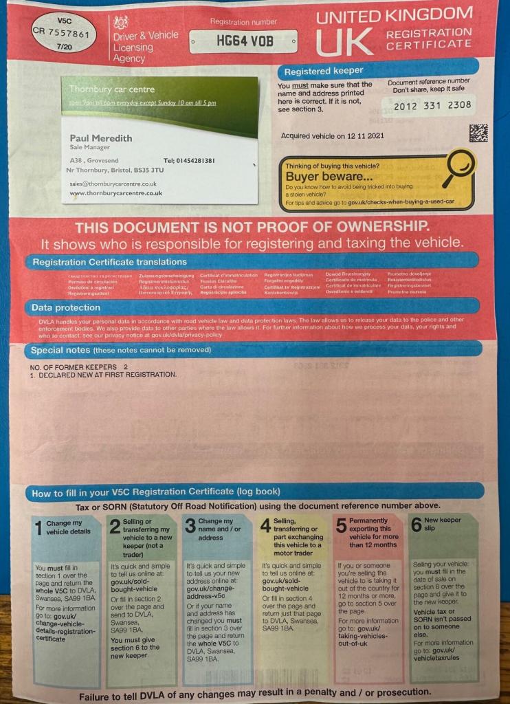 - Original number plateAdvisoryDifferent number plates are commonplace. Ensure the number plates on the car match the V5C documentation. Be sure of what number plate comes with the car you are buying.