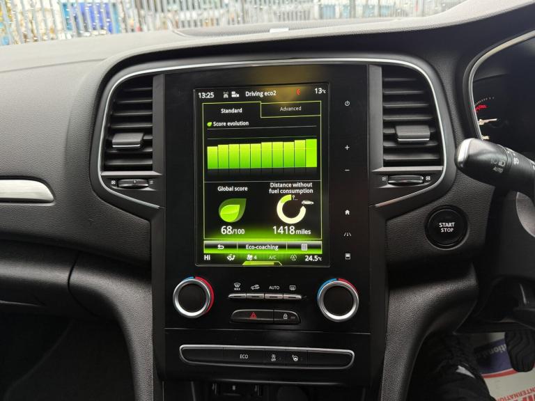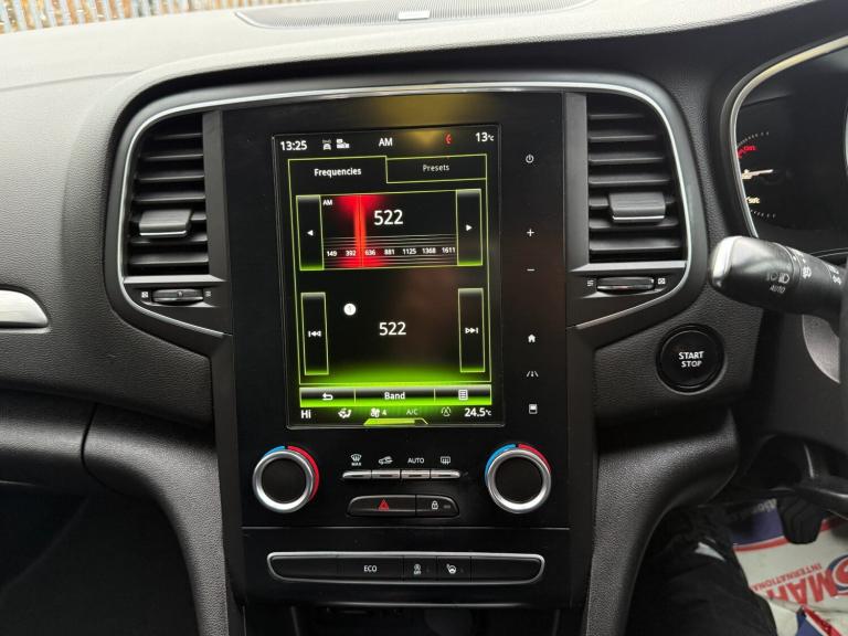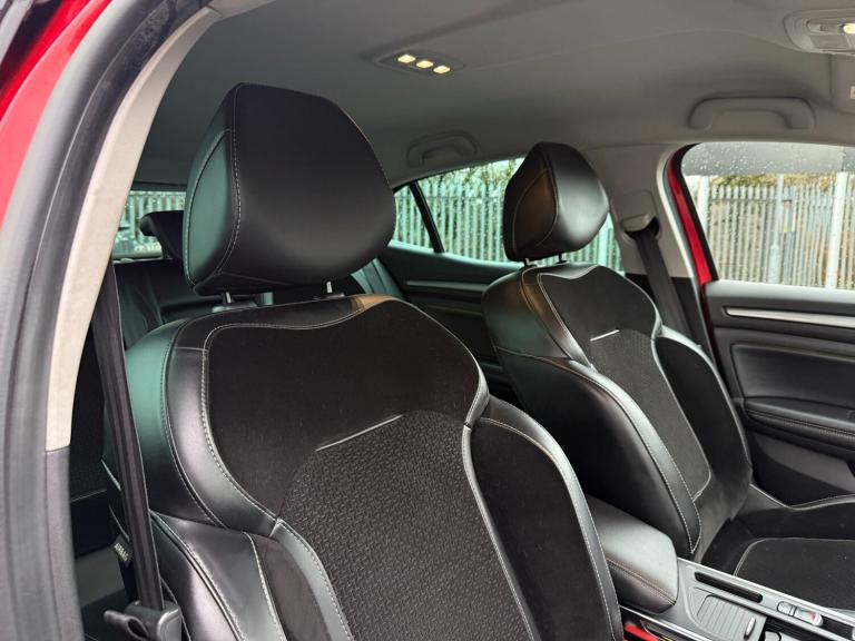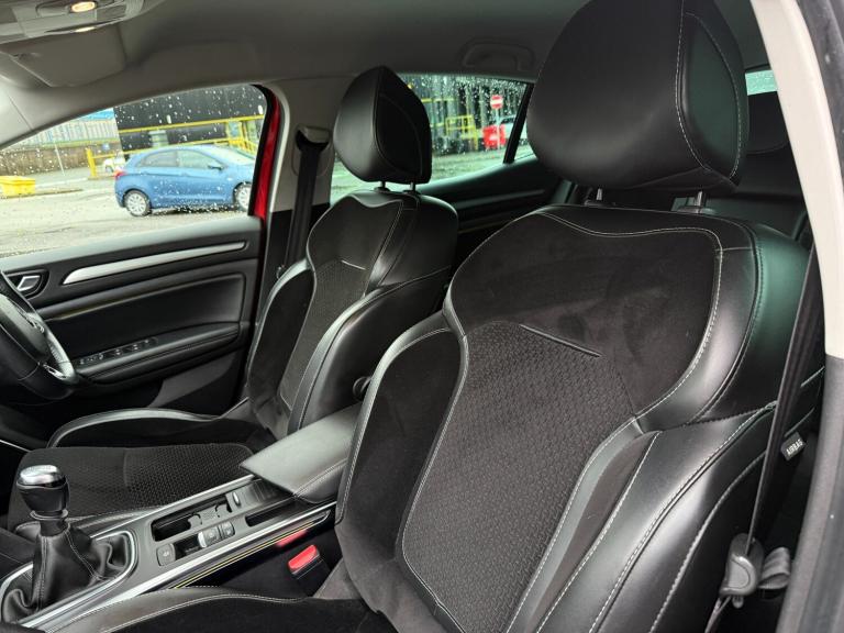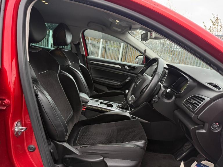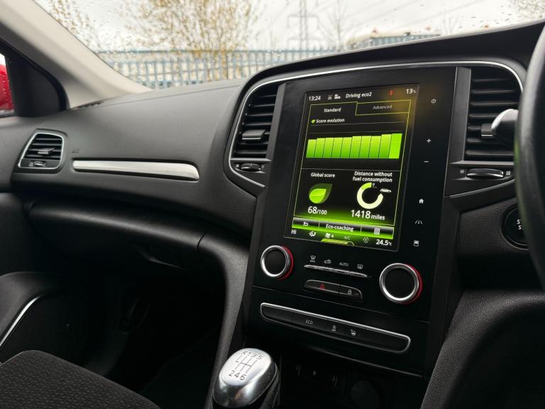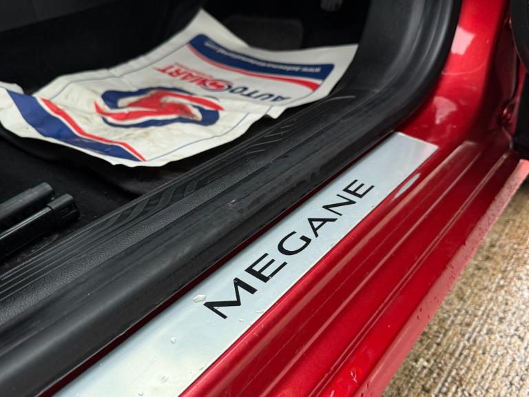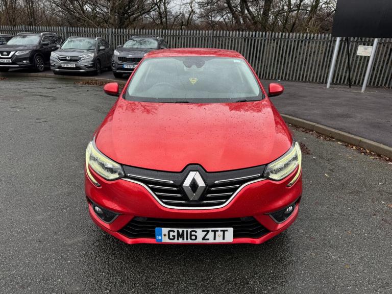 This 2016 16 reg Renault Megane Dynamique S Nav 1.5 dCi in Flame Red is a smart and economical ULEZ compliant hatchback showing 130k miles and priced at 4495 pounds, offering excellent spec including full LED headlamps, 17 inch diamond cut alloys, rear parking sensors, automatic headlights and wipers, cruise control with speed limiter, dual zone climate control, electric front and rear windows, electric folding heated mirrors, extra tinted rear glass, R-Link 8.7 inch touchscreen with navigation, Arkamys 3D sound, DAB radio, Bluetooth, USB, fingertip audio controls, digital TFT speedometer, keycard hands free entry and start, leather steering wheel, adjustable Multisense driving modes and a Parking Pack Premium. Strong safety features include multiple airbags, ISOFIX, ABS with EBD, emergency brake assist, ESP, hill start assist, tyre pressure monitoring and an electronic parking brake, making this a high spec and great value diesel hatchback ready to drive away.